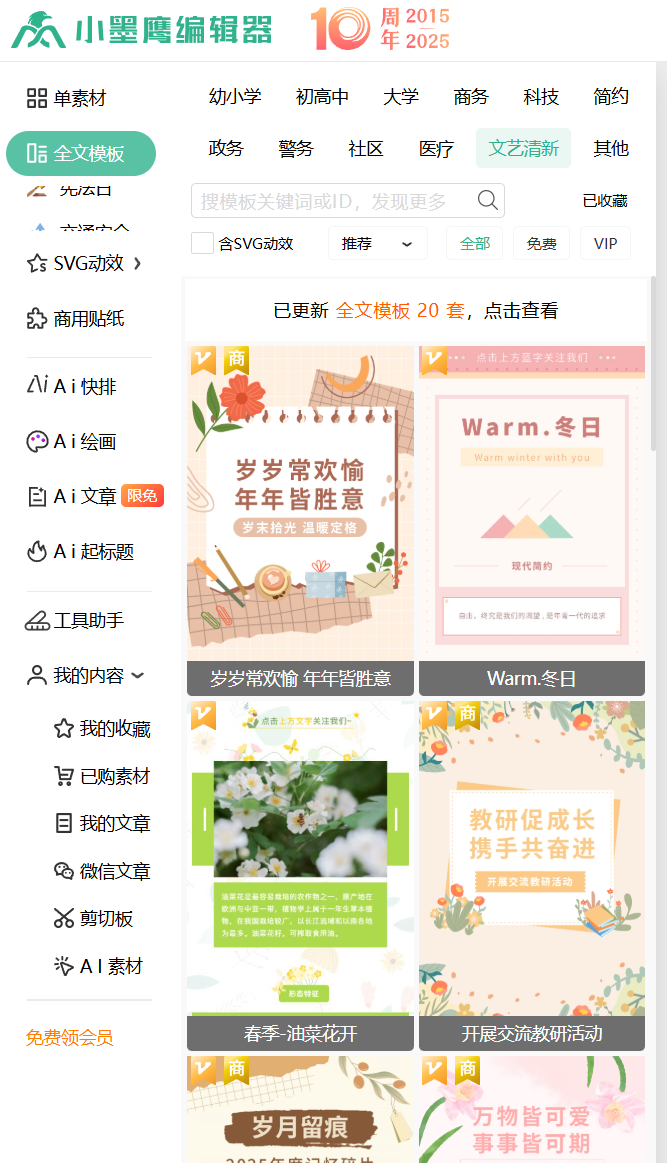 海量素材库:25万+单素材、10000+全文模板、3000+SVG动效,一键套用,风格多样,轻松满足各种需求。