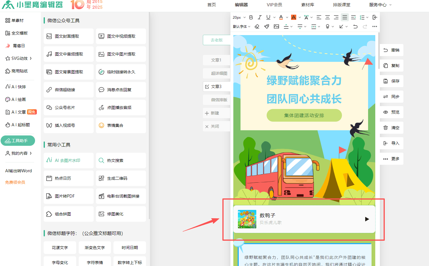我甚至傻乎乎地用另一部手机录屏,想着后期再把音频分离出来,结果音质差得根本没法用。正当我抓耳挠腮,准备去音乐平台大海捞针时,同事轻描淡写地说了一句:“你用小墨鹰编辑器的‘图文中音频提取’工具啊,一秒搞定。”
