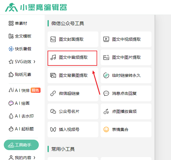 “提取?”我将信将疑地打开了小墨鹰编辑器。在左侧素材栏里,我找到了一个叫“工具助手”的宝藏分类,点进去,果然,“图文中音频提取”几个字安静地待在那里。