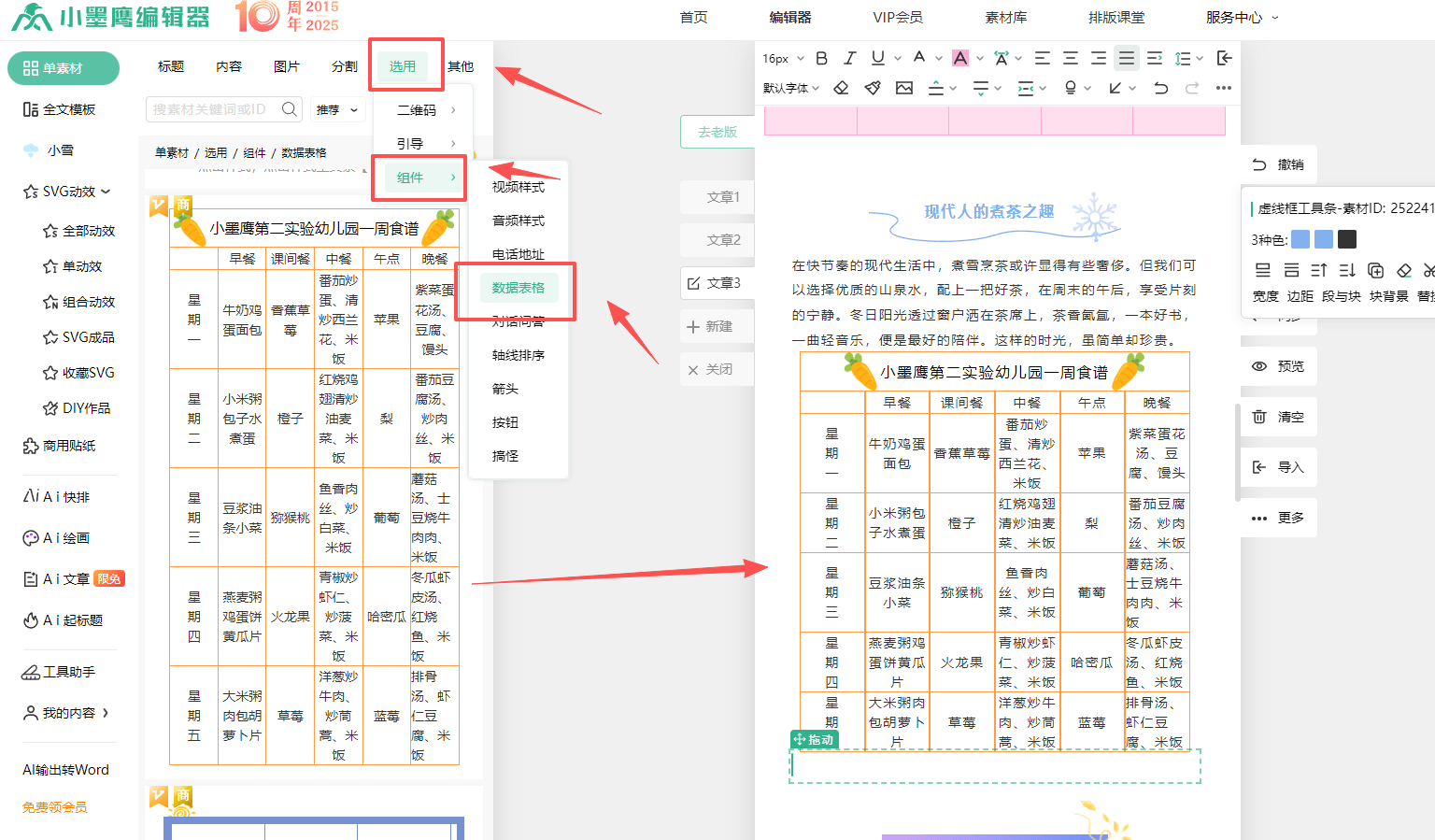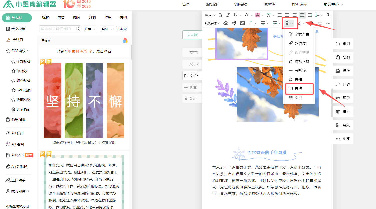 A1: 别叫大神,我也是从找不到北过来的。你仔细看小墨鹰编辑区顶部的工具栏,在一堆小功能里,有一个图标就叫【表格】!点它,你就能自定义行数和列数,像搭积木一样把框架先建起来。
