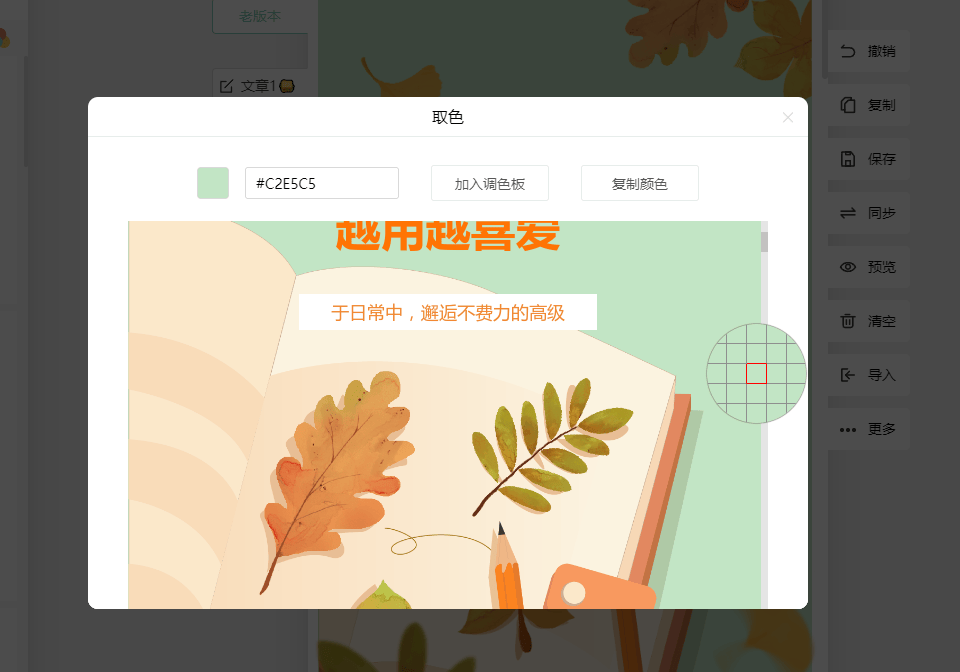 更贴心的是,旁边还有个取色器功能,可以让我直接吸取模板中已有的颜色——比如标题的颜色、背景色块或者装饰元素的颜色,取色后轻松加入调色板。