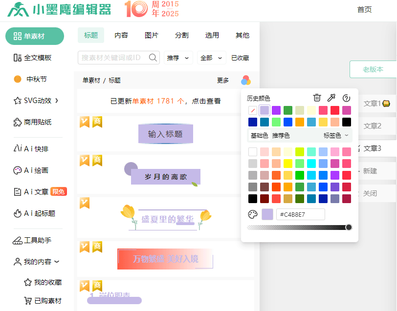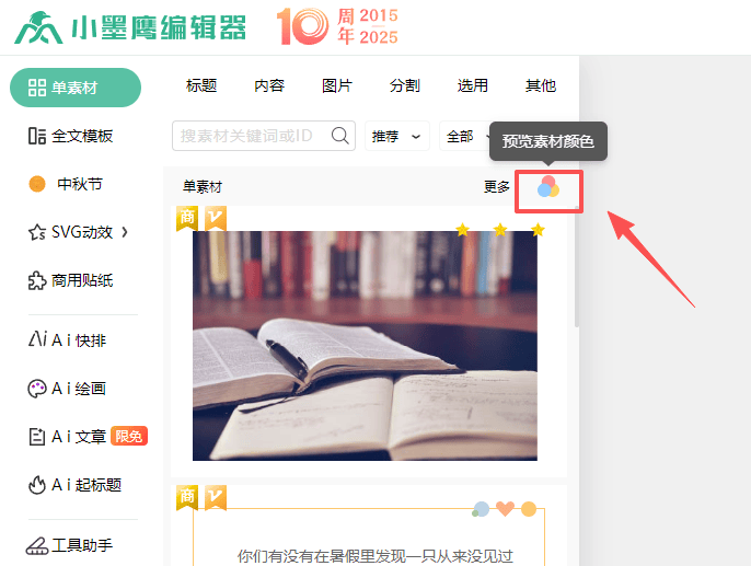 直到最近,我才偶然发现小墨鹰编辑器里一个超好用的小功能,真的帮我省了不少事。就在单素材里有一个小小的色块图标,点开之后可以直接调整这个素材的主色调!