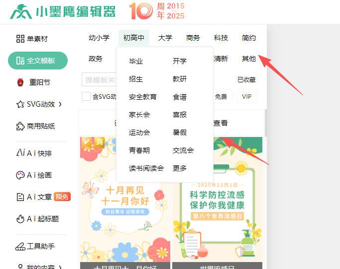 光有菜单还不够,内容才是王道。这时候就要说说编辑器里的行业模板了。我在"全文模板"里找到了适合我们行业的模板,比如教育培训类、生活服务类等等。选好模板一键写入,再根据自己的需求调整内容,整个过程特别流畅。