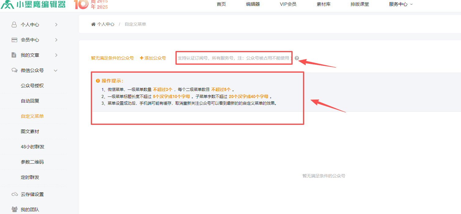 进入公众号后台,在小墨鹰编辑器右上角头像下找到自定义菜单,进入后就能设置。不过这里有几个关键设置要注意: