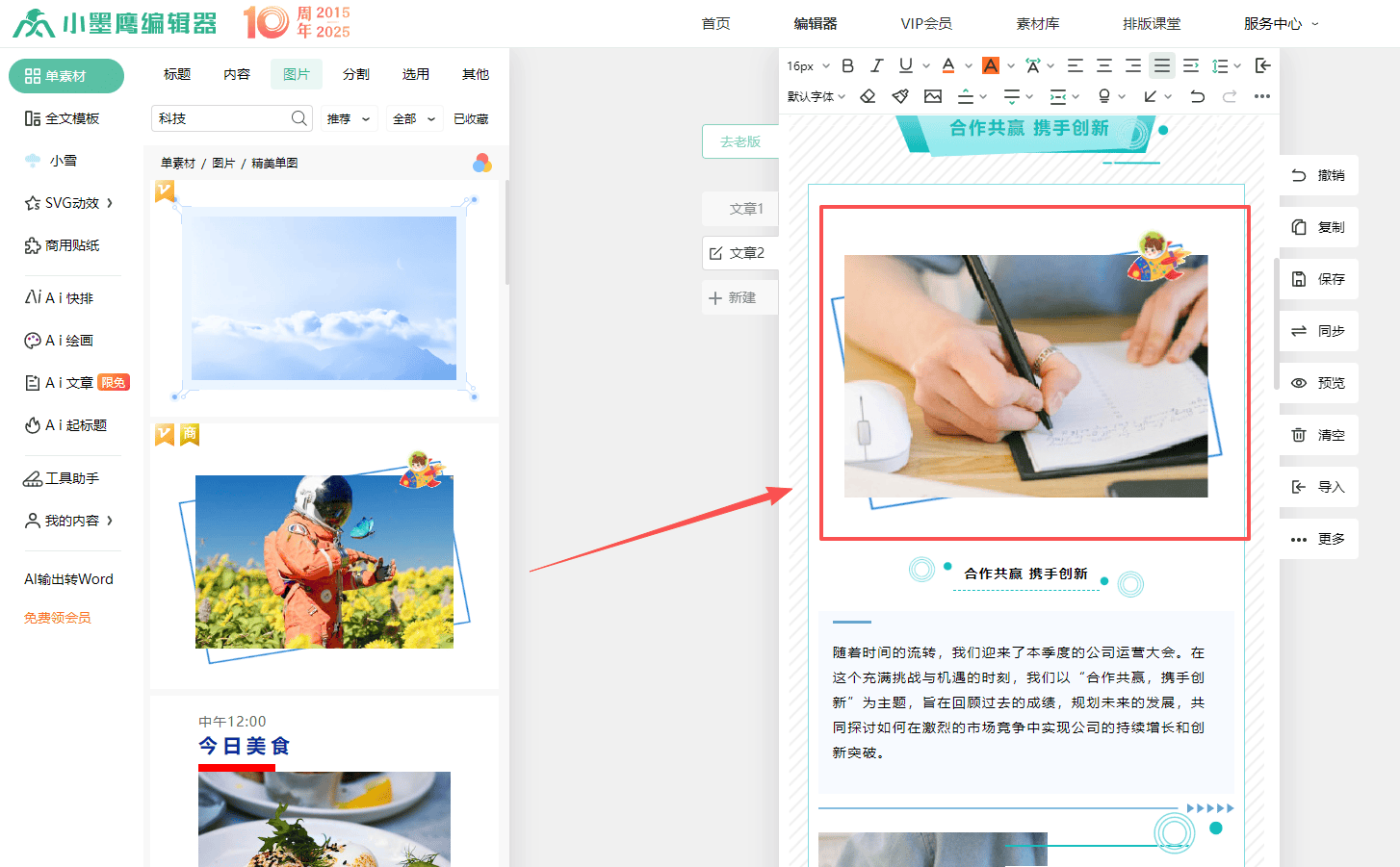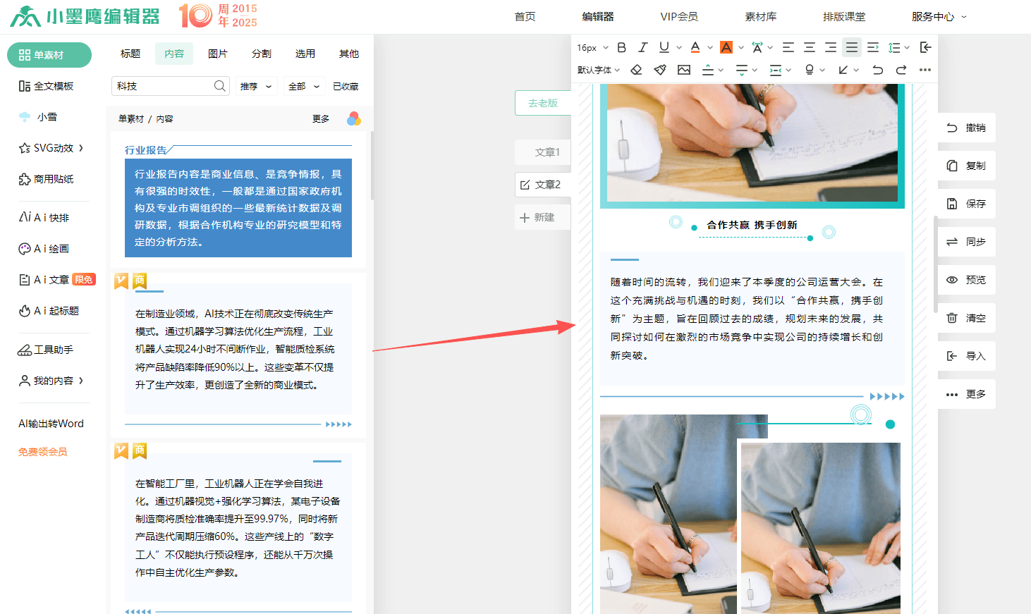 点击之后,直接来到小墨鹰编辑器左侧素材库中,使用想要替换的素材,内容不变,自动秒刷上单素材的样式了!