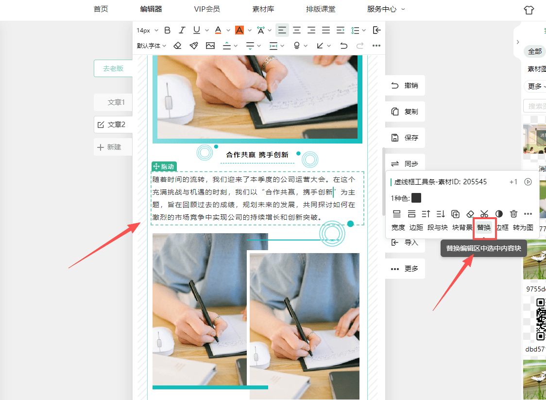 点击虚线框,发现之前没注意到的小墨鹰编辑器的虚线框工具条上有个替换按钮。