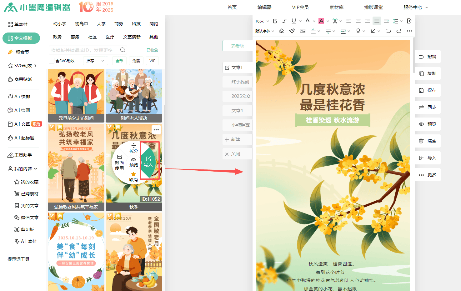 说到文章内容,我也摸索出了一个提升效率的好方法。以前我总是一个个找单素材,拼凑起来特别费时间。后来发现,用小墨鹰编辑器"全文模板"真的方便太多了!