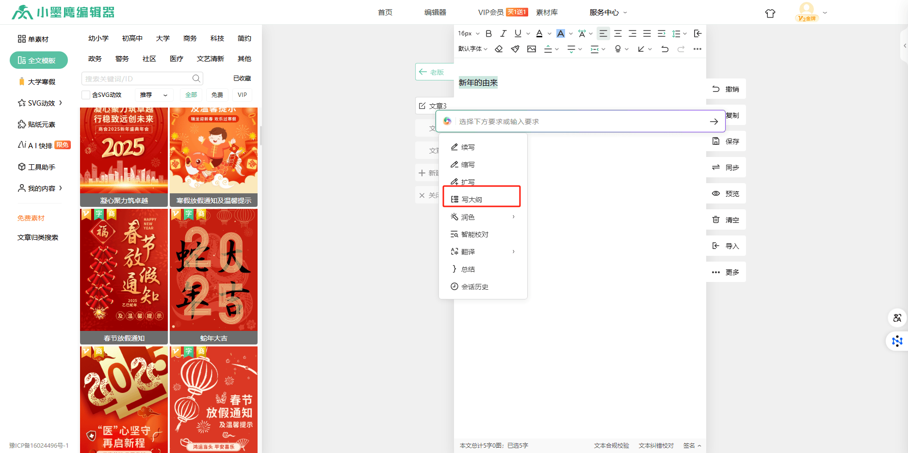 选中写大纲,就能根据主题生成一篇大纲内容。