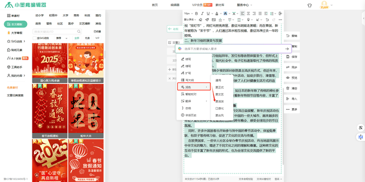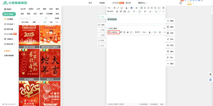 使用文字工具条上的“AI帮我改”,里面有好多AI智能写作助手的功能。
