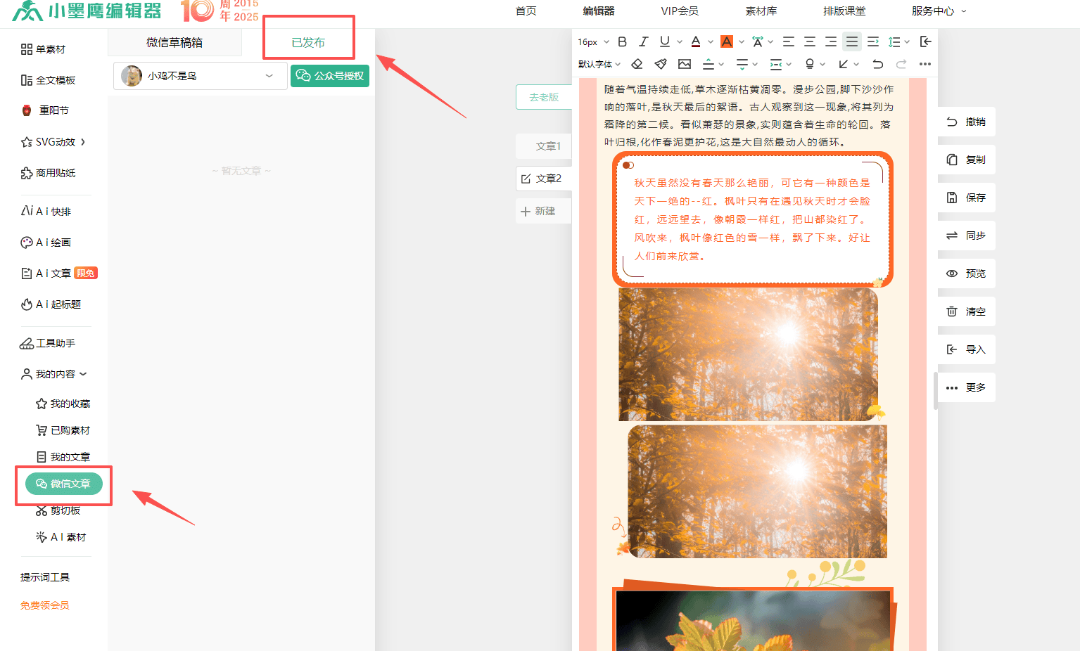 这个就有点特别了,要在小墨鹰编辑器左侧微信文章里才能找到。先把文章同步到公众号草稿箱,然后回到编辑器点击“发布”。这里要特别提醒大家:2025年7月起,个人账号和没认证的企业账号就不能发布永久链接了。所以如果想长期使用这个功能,最好早点完成认证。