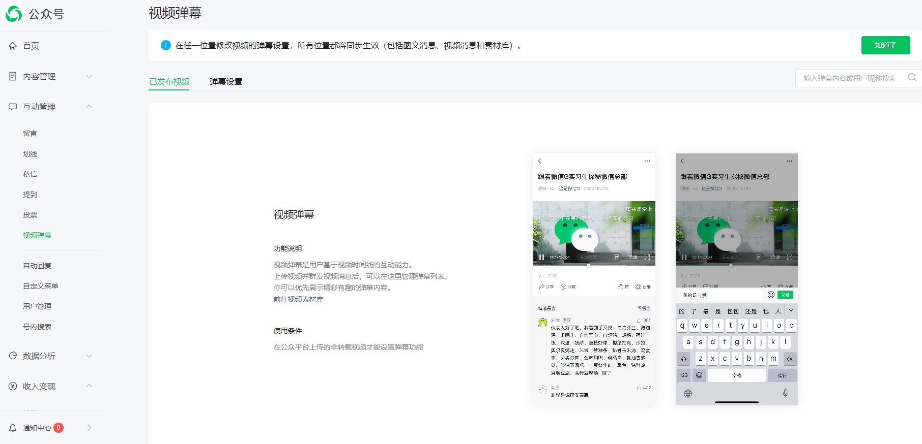 事情是这样的:那天我照常发了个教学视频,数据平平无奇。正郁闷时,偶然在公众号后台左侧菜单栏发现了“互动管理”这个选项。点进去一看,哇!原来这里可以管理所有发过的视频,还能设置弹幕!