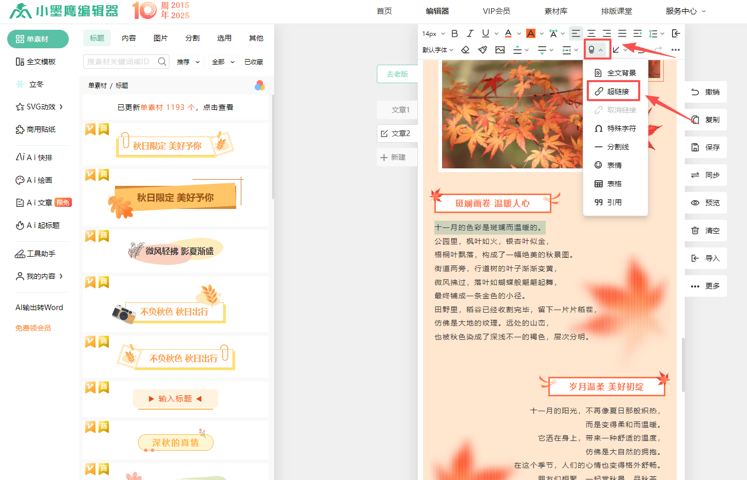 首先,选中你想要添加小程序链接的文字或者图片。比如我选中了“立即购买”这四个字,然后看向小墨用编辑器顶部工具栏,找到那个链条形状的“超链接”图标。