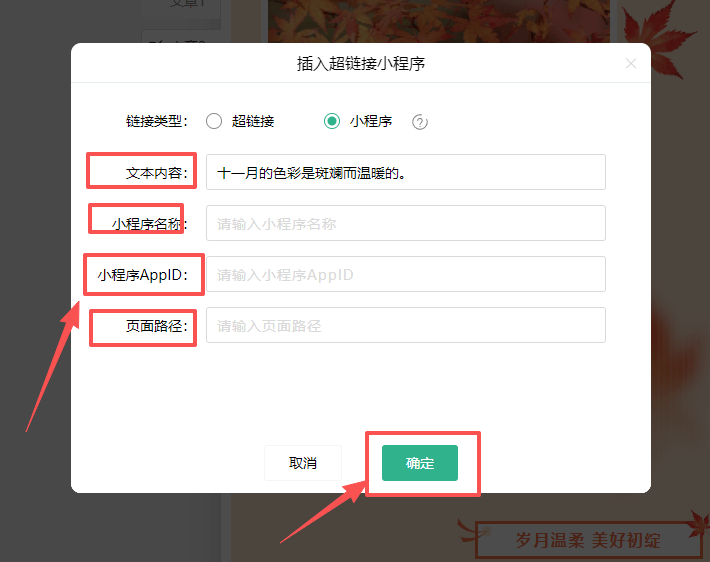 点击后会出现一个弹窗,这里有个关键选择——默认是“超链接”选项,但旁边还有个“小程序”的选项卡!点开它,就能看到各种小程序的配置选项。你可以通过搜索找到自己的小程序,或者直接输入小程序的原始ID。