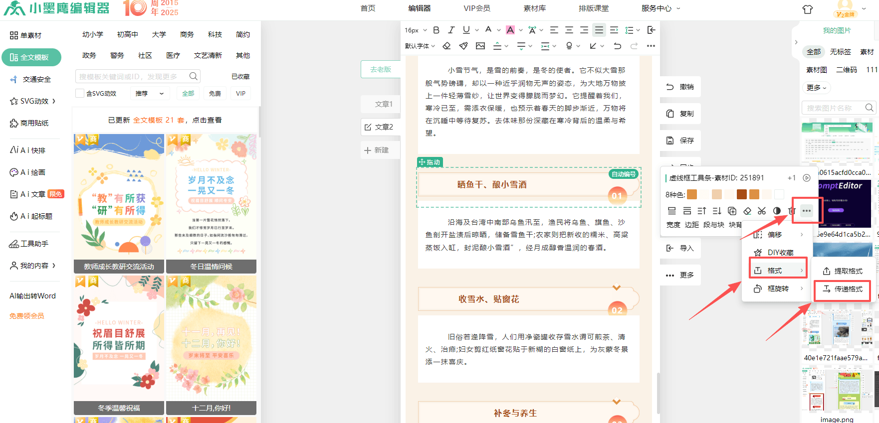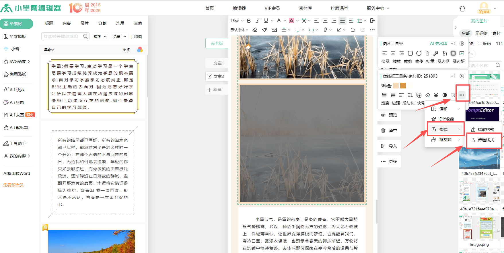 直到隔壁工位的王姐凑过来,看了一眼我的屏幕,她拿过我的鼠标,在一个已经调好的标题上点了一下,然后虚线框工具条-更多功能中找到传递格式的功能,在编辑区中素材ID相同的素材,字体、大小、颜色、间距,瞬间变得一模一样!