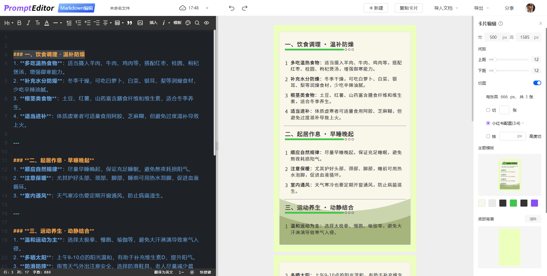 现在我的立冬文字卡片制作流程变得特别顺畅:AI生成灵感文案 → 用转换器净化格式 → 在公众号编辑器里自由排版。省下来的时间,可以专心调整卡片的字体、配色和背景图,让立冬的温暖感透过屏幕传递给读者。