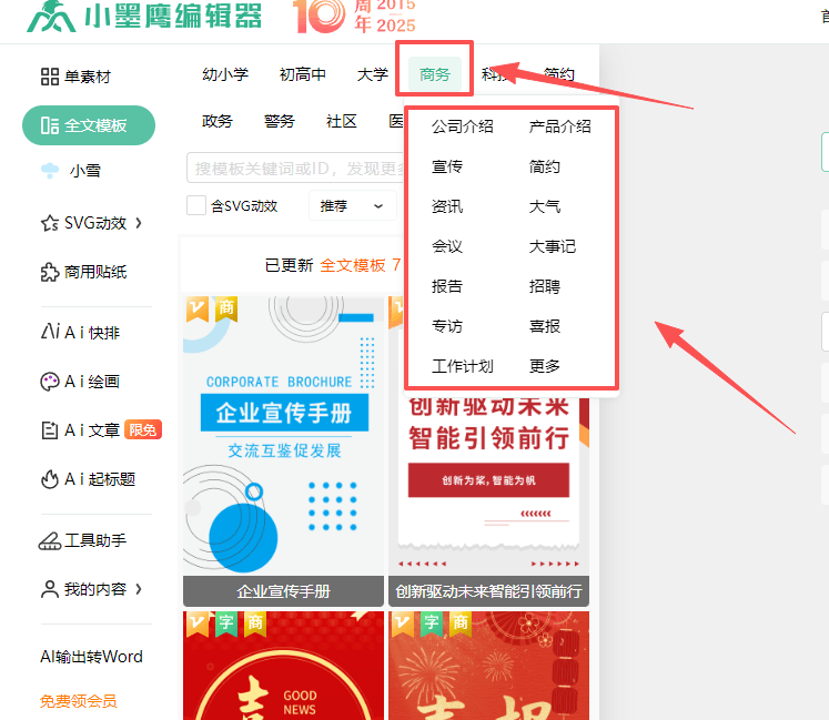 后来偶然间发现,原来商务模板都在全文模板里,只是需要找对入口。点击编辑器左侧的「全文模板」后,顶部会出现一排分类导航,那个蓝色的「商务」分类就像藏宝图上的钥匙孔——点进去瞬间,各种专业的商务模板终于呈现在眼前。