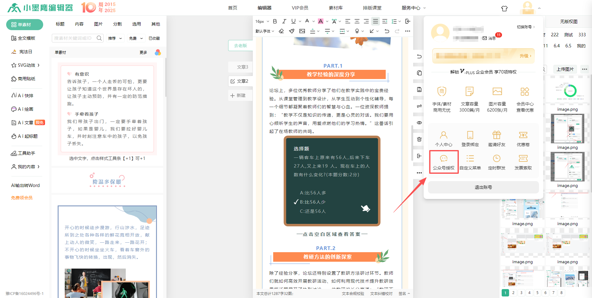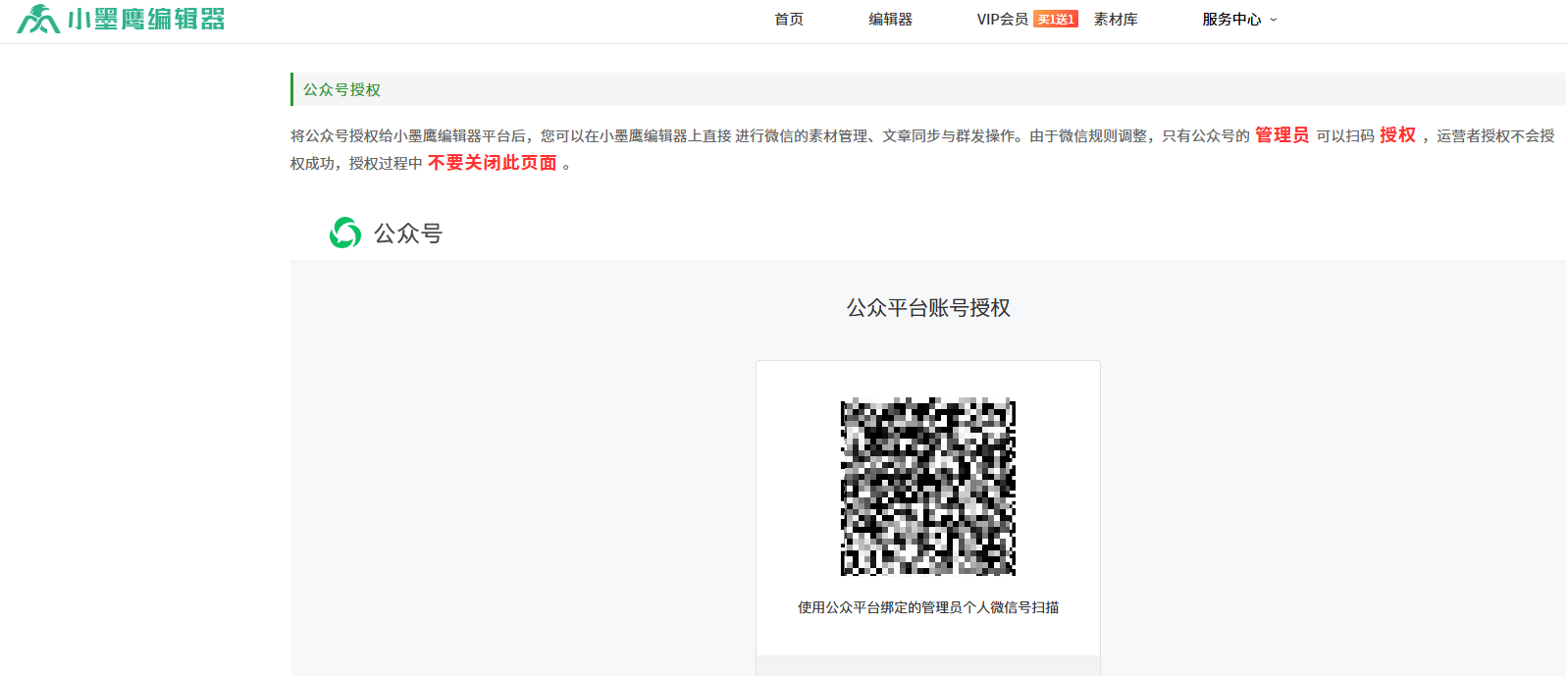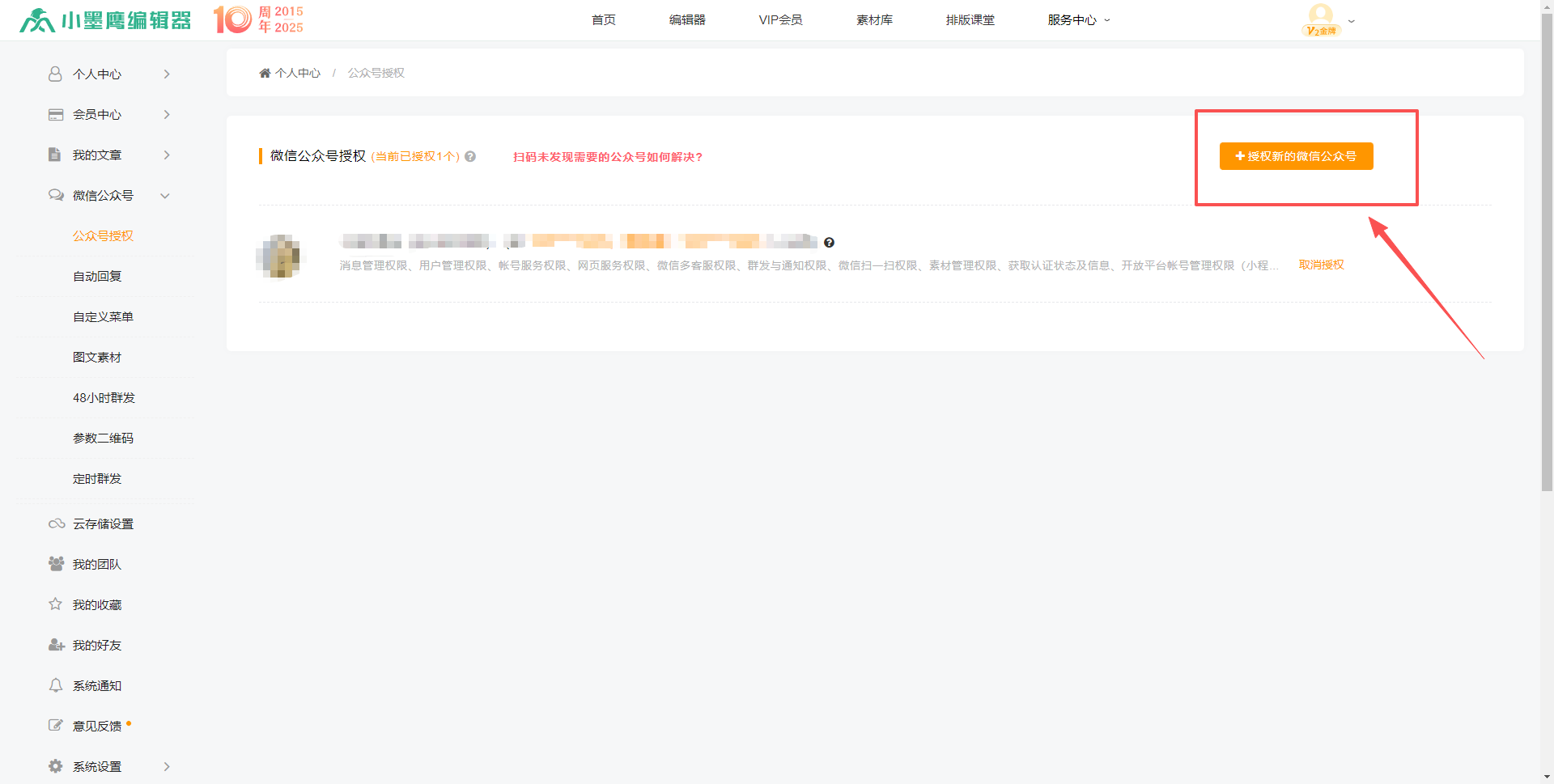 步骤一:登录小墨鹰编辑器,点击编辑器首页右上角头像下的“公众号授权”。