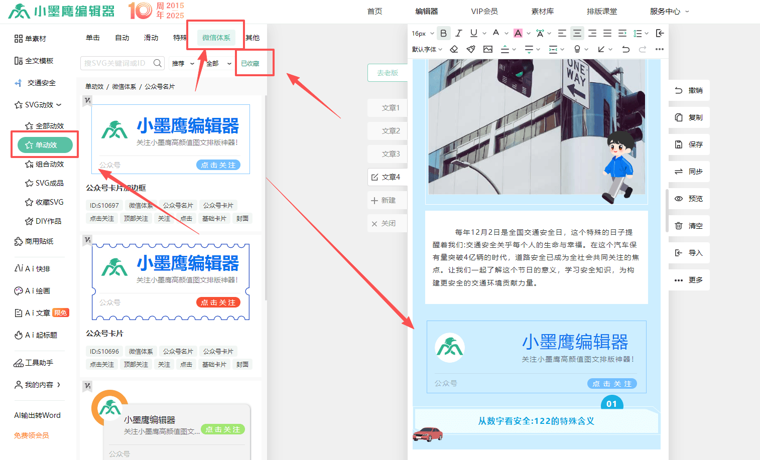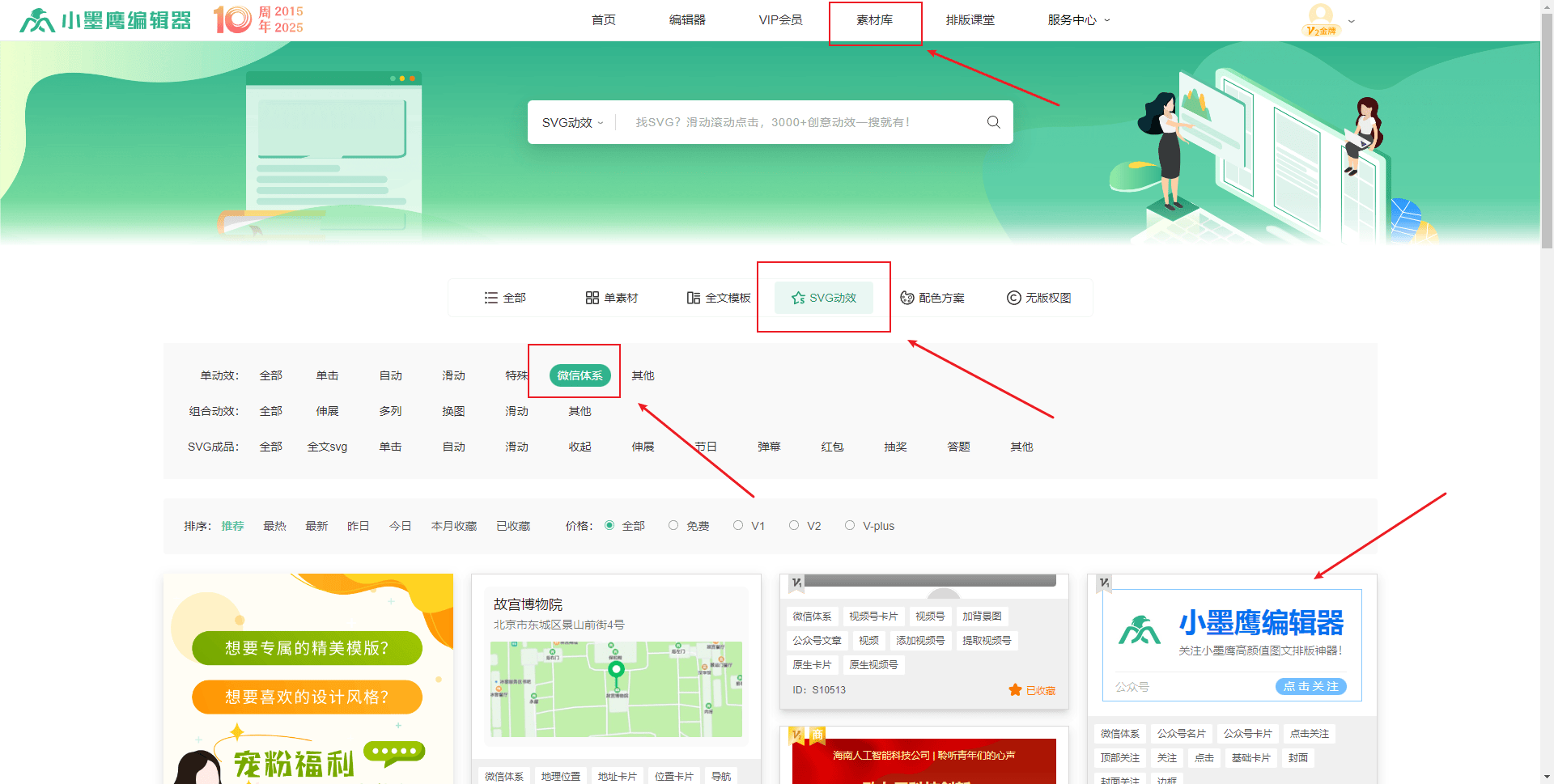 后来我才摸到门路,原来没那么复杂。就在小墨鹰编辑器的左边,有个叫“SVG动效”的按钮,你点进去,里面有个分类直接就叫“微信体系”,好家伙,全是微信自家用的宝贝,公众号名片素材就在里头躺着呢!
