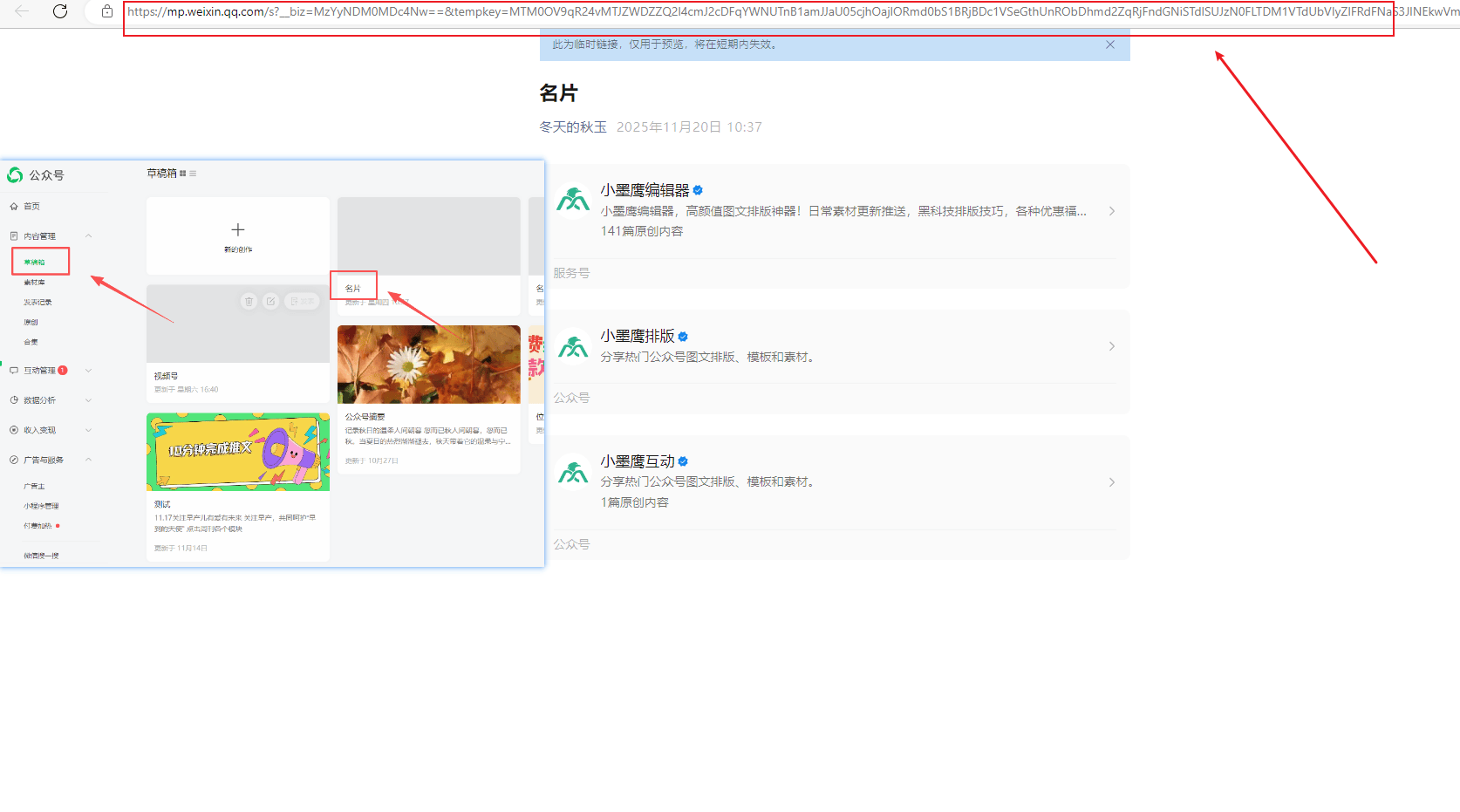 等你把素材拉进文章里,它会提示你要放文章链接。这里有个巨坑!你可千万别直接把正在编辑的这篇文章的链接复制进去,那没用。你得先去公众号后台的“草稿箱”,找到你那篇已经保存好的文章,点它的标题,浏览器地址栏里那个链接,才是能用的“临时链接”。
