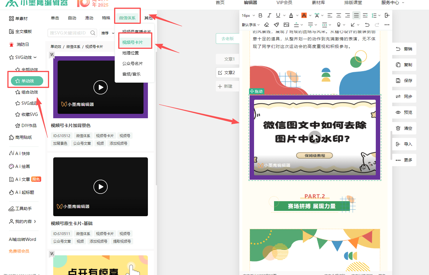 后来摸索了半天,终于找到了让视频号内容变好看的妙招。原来关键在于借助小墨鹰编辑器的素材库,把单调的视频框变成各种好看的样式。