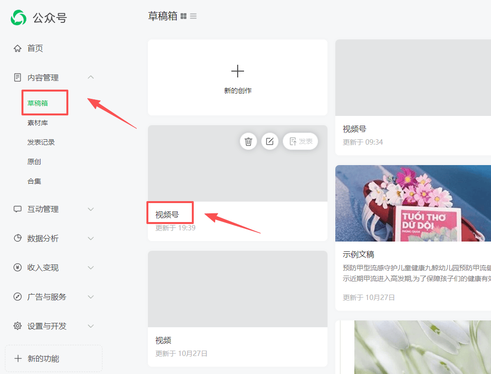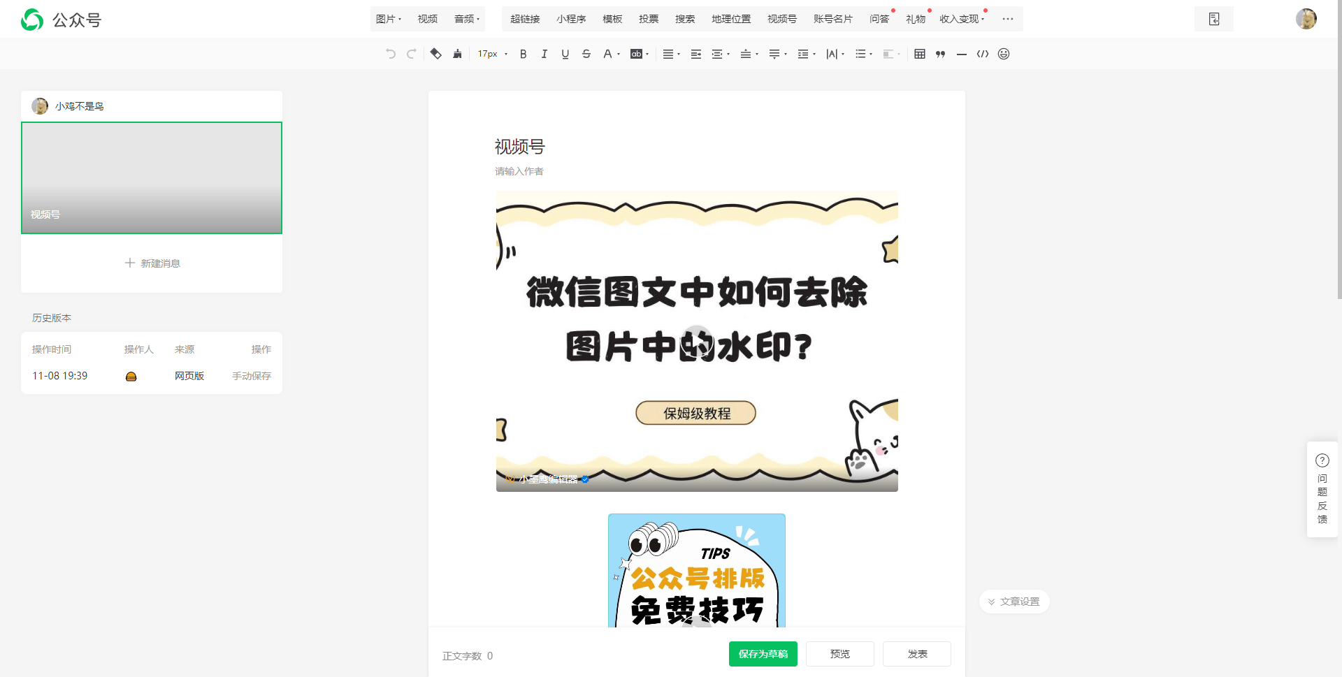 首先还是要在公众号后台正常操作一遍:在草稿文章里点击插入视频号,选择你要用的视频保存好。这里要注意,只需要保存为草稿就行,千万别发布。