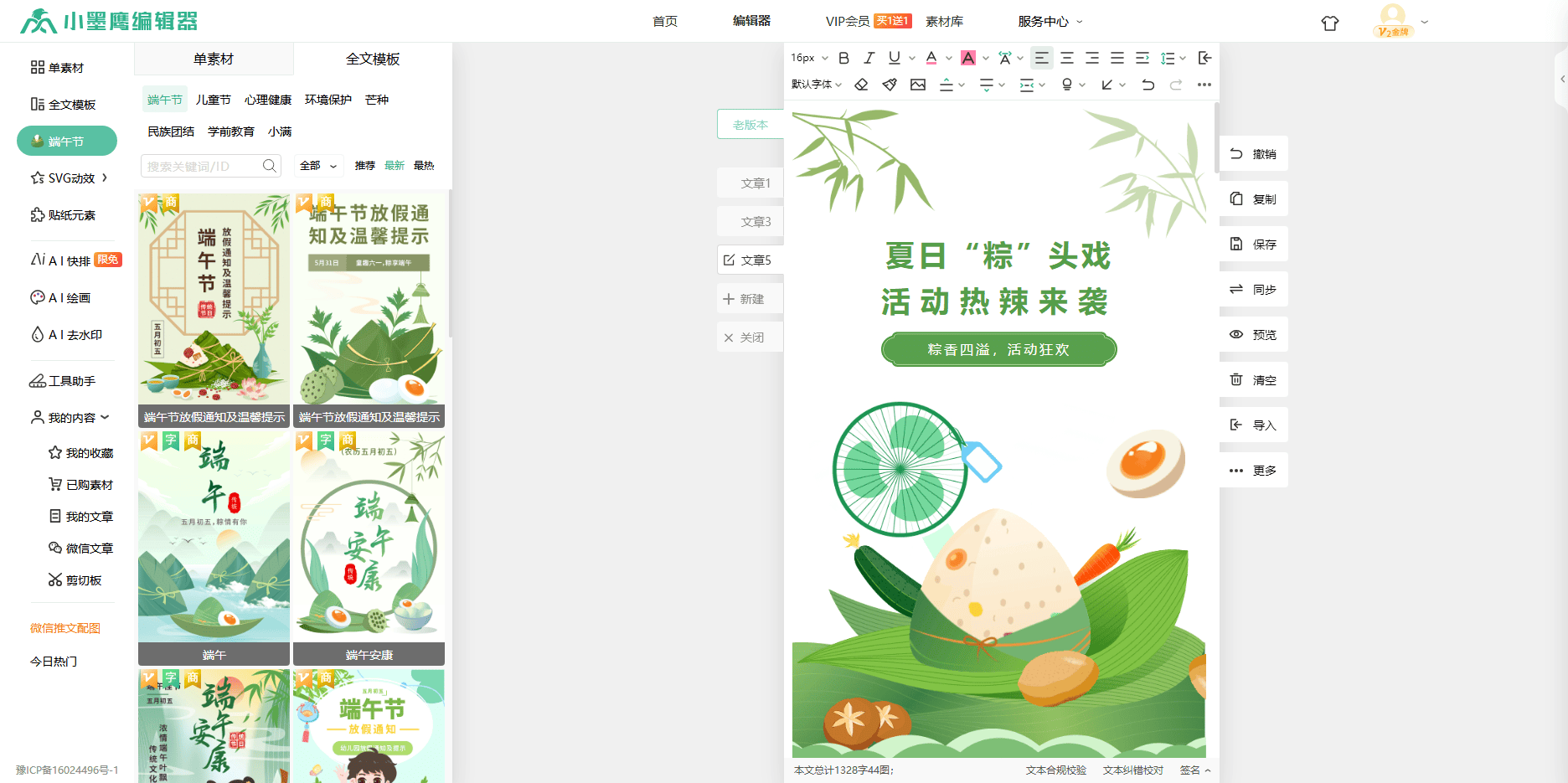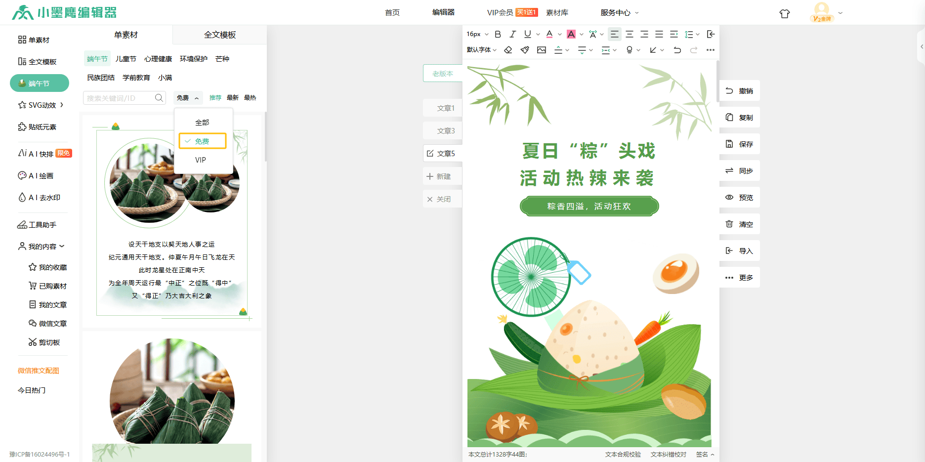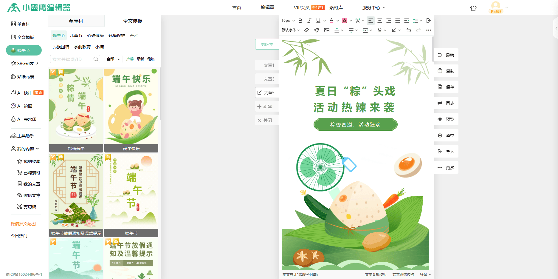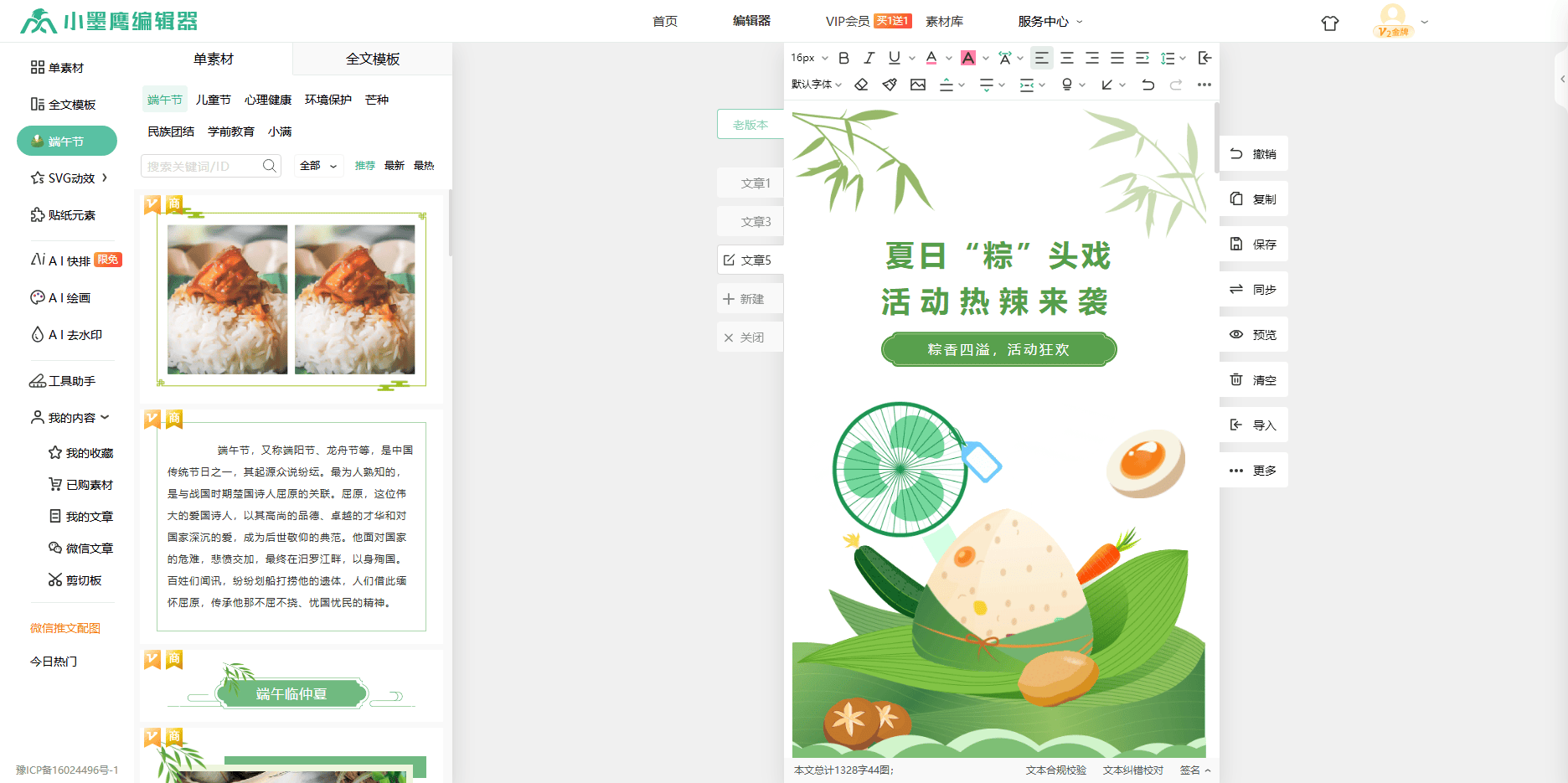 就拿端午节来说,当别人还在为素材发愁,在各种素材库里翻箱倒柜时,使用小墨鹰编辑器热点日历的新媒体人只需轻轻一点,就能实现端午节单素材和模板一键切换。这就好比武林高手得到了一本绝世秘籍,瞬间功力大增。