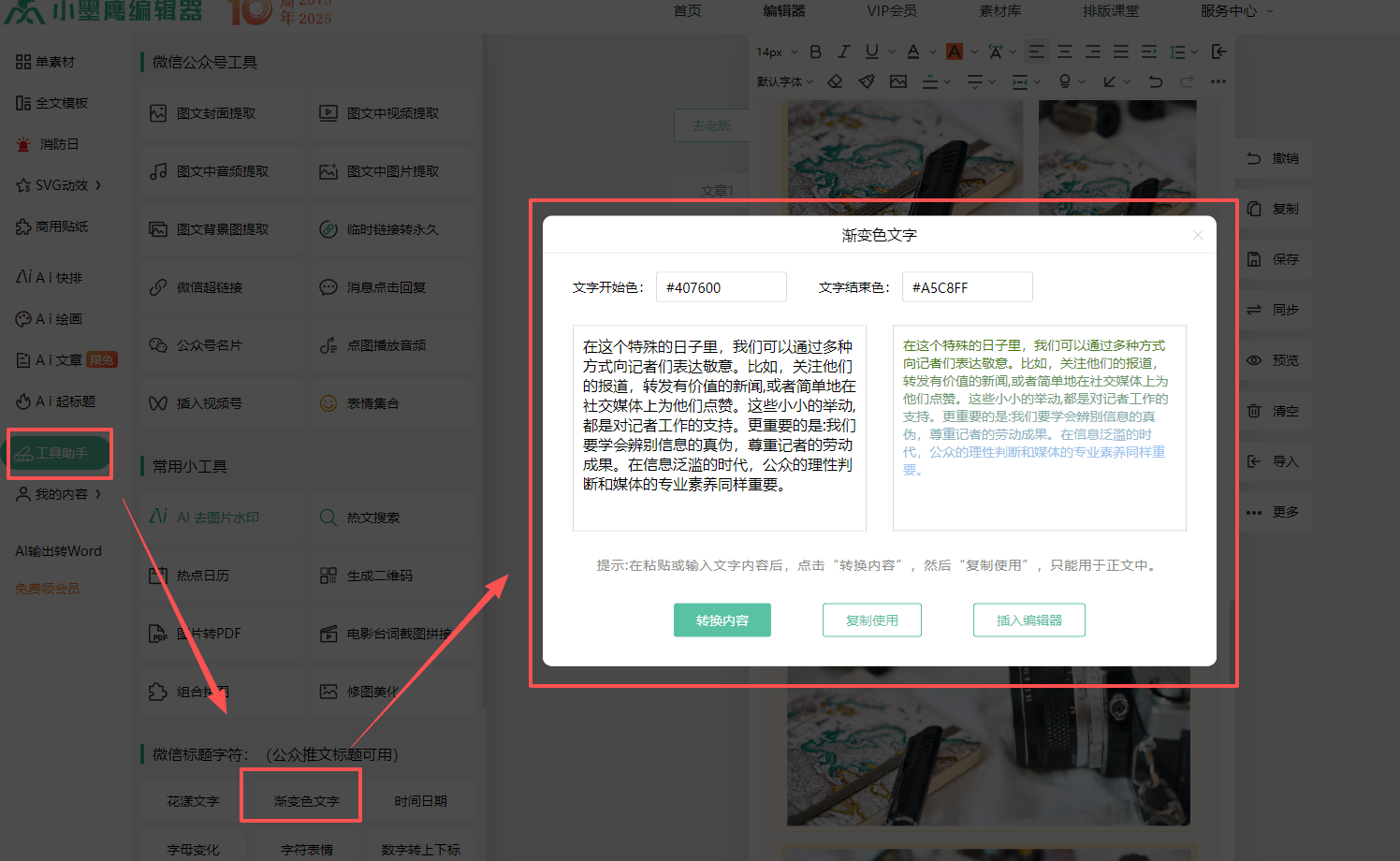 有一次看到别人家的推文用了渐变色标题,从蓝色自然过渡到紫色,特别有设计感。我琢磨了好久,终于在小墨鹰编辑器"工具助手"里找到了"渐变色文字"这个功能。