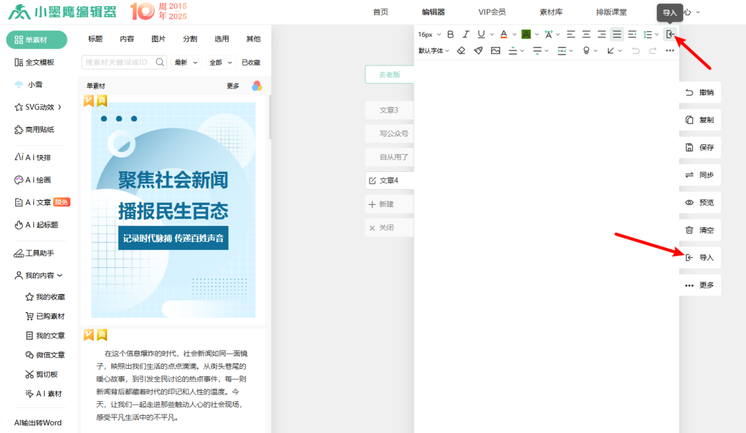 打开小墨鹰编辑器,有两种方式找到导入功能:要么点击顶部导航栏的「导入」按钮,要么点击编辑区右侧的「导入」按钮;