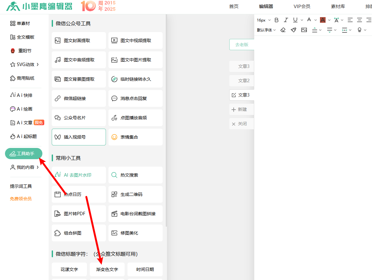 那么,渐变文字哪里找呢?打开小墨鹰编辑器,点击左边的工具助手,选择微信标题字符中的渐变色文字;