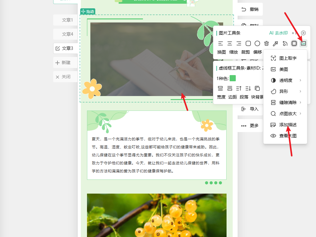 1、操作步骤特别简单,就拿文章里的任意一张图片举例:先点击选中你想加描述的图片,接着在图片上方的工具条里找到 “更多” 按钮点一下,然后选择 “添加描述” 选项;