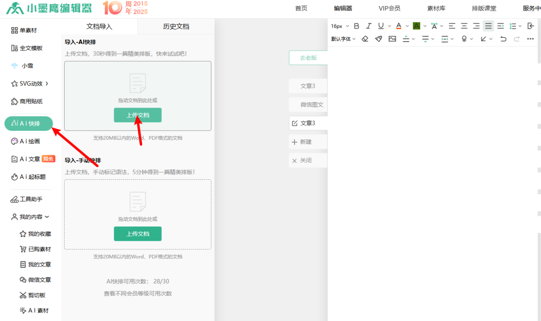 我常用的那个“AI快排”功能才是真香——把写好的文档导入进去,然后选个模板,几秒钟就排得漂漂亮亮。以前排版一篇文章得折腾半小时,现在五分钟搞定,剩下的时间正好琢磨怎么写好后面那7篇。