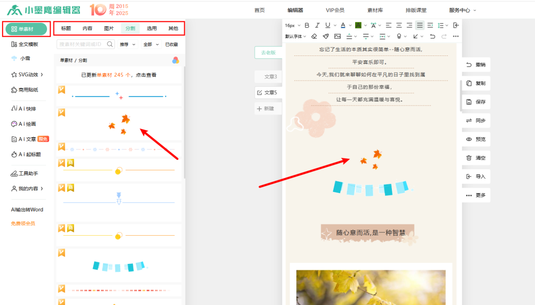 对小墨鹰这类编辑器,我的使用公式就是:“整体模板打底 + 零散素材点缀”。记住这个顺序,排版就不会手忙脚乱。