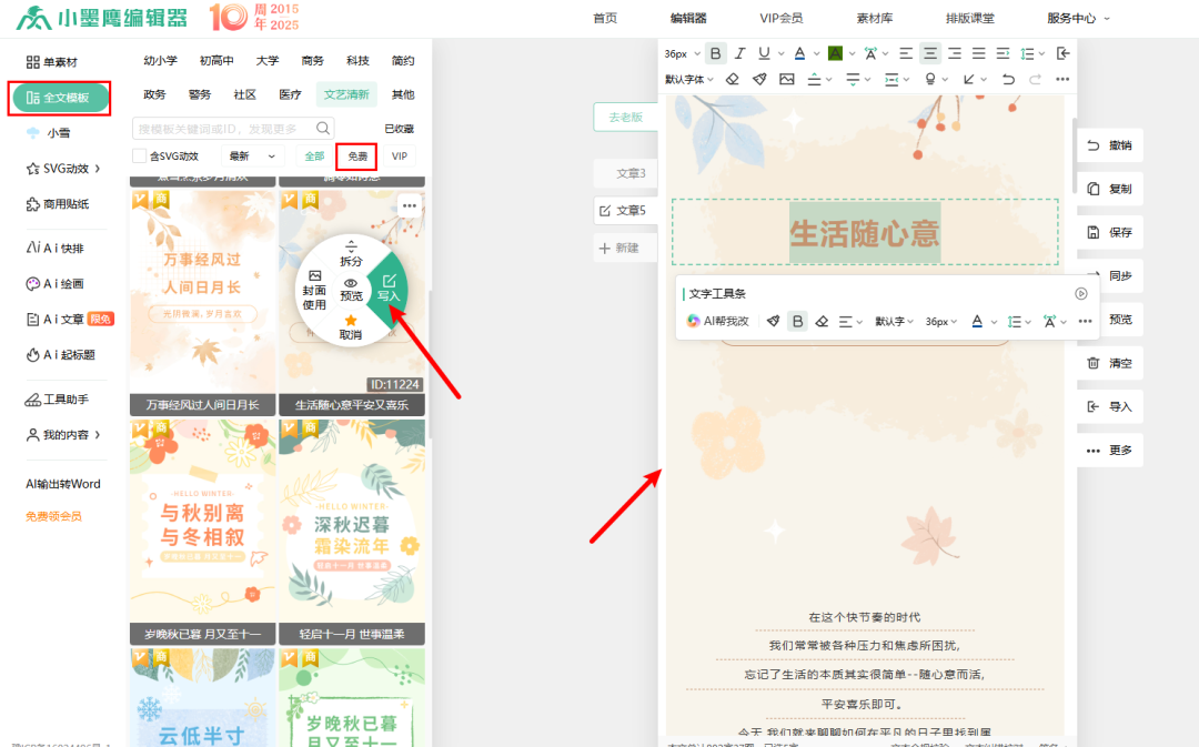 然后去小墨鹰的模板库里,根据分类筛选。找到一眼看中的整体模板后,直接点击套用。这时,你的文章就有了一个现成的“骨架”和“样貌”。你要做的,就是把自己的文字和图片“填”进去,像填空一样简单。这能保证你整篇文章的风格是统一、协调的。