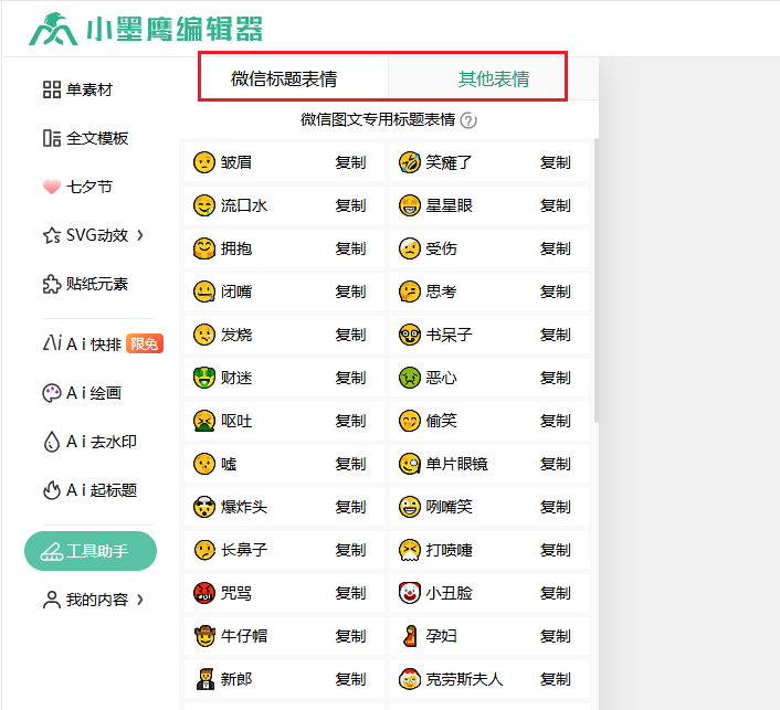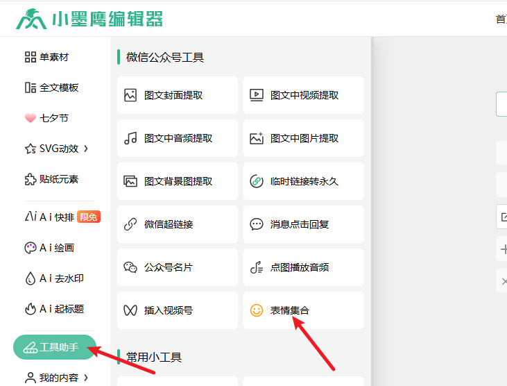 1、打开小墨鹰编辑器,点左边「工具助手」,找里面的「表情集合」就行。