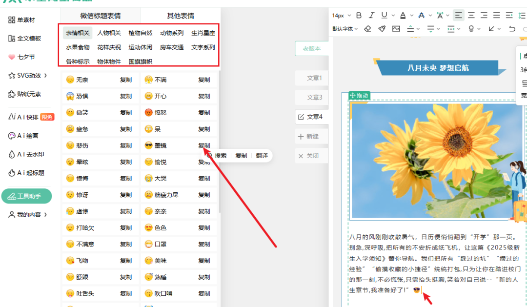 3、表情种类也特全,挑到喜欢的点「复制」,再粘贴到文章里就完事了。