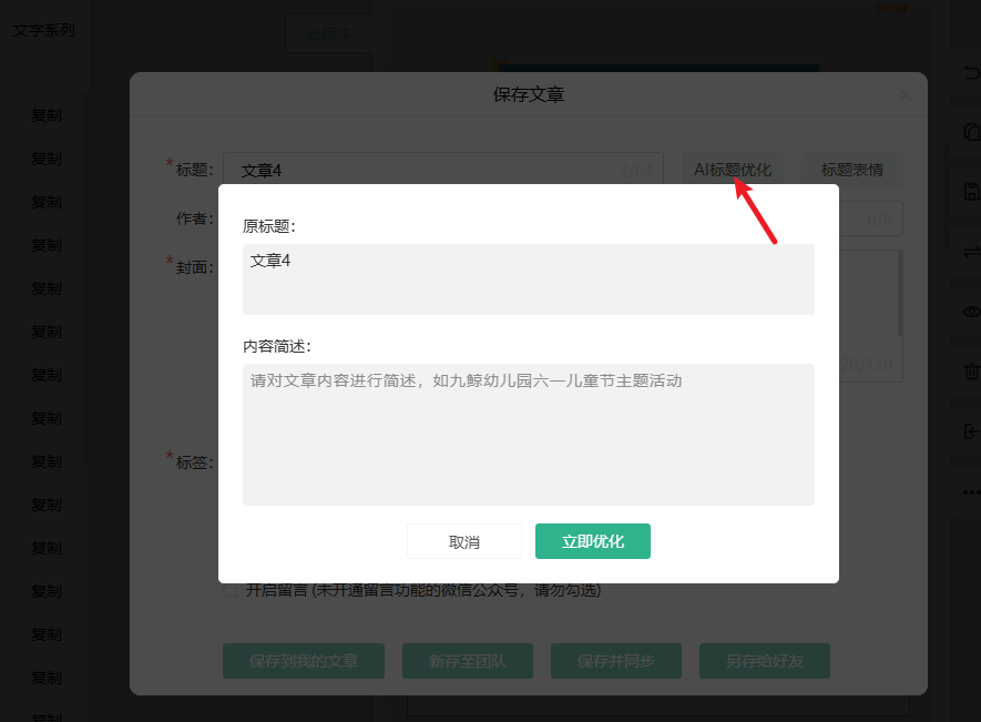 4、对了!保存文章的时候,还能顺便点下「AI 标题优化」,给标题润润色,表情加了、标题也优化了,一举两得~