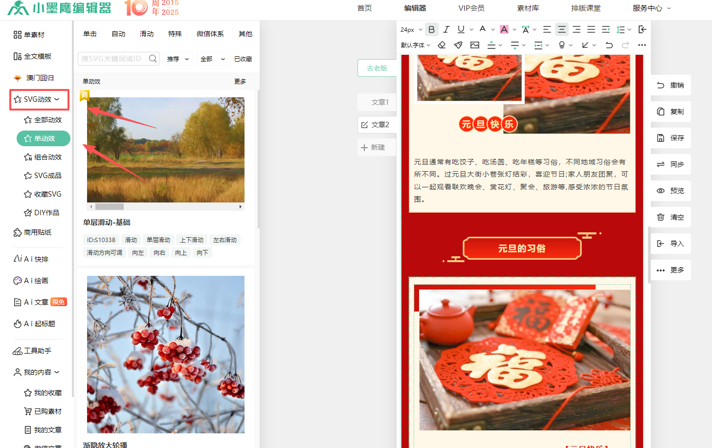 操作简单,全程“拖拖点点”。它的界面很清晰,左边是各种素材和模板,中间是编辑区,右边是细节调整。基本上我想用什么,就从左边拉过来,然后在右边改改文字、换换图片。全部弄好之后,一键复制到公众号后台,格式基本不会乱,不用再焦头烂额地调间距了。