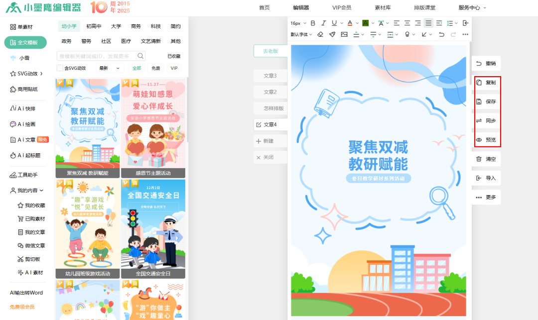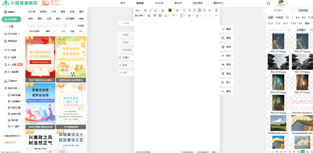 创建新图文:点击“新建图文”,进入编辑界面。通常分为三个区域:左侧【素材库】、中间【编辑区】、右侧【图库】。