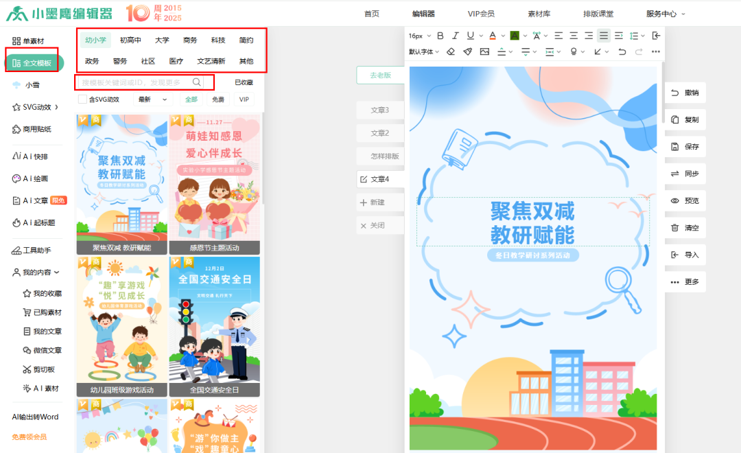 如果你是纯新手,最快的方法是直接使用 “整套模板” 。在左侧样式库找到“整套模板”,选择一个符合你文章风格(如科技、文艺、简约)的模板,直接套用,然后替换里面的文字和图片即可。