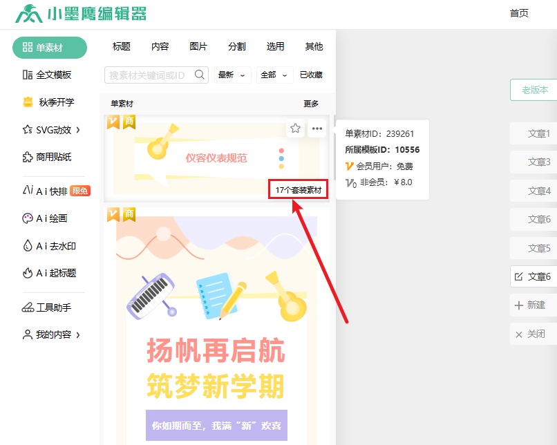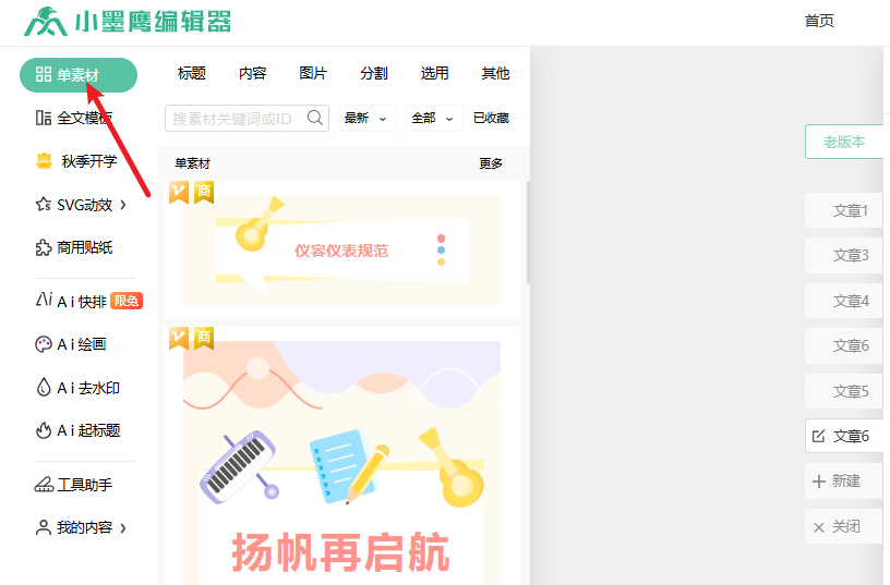 1、打开小墨鹰编辑器,点左边的「单素材」;