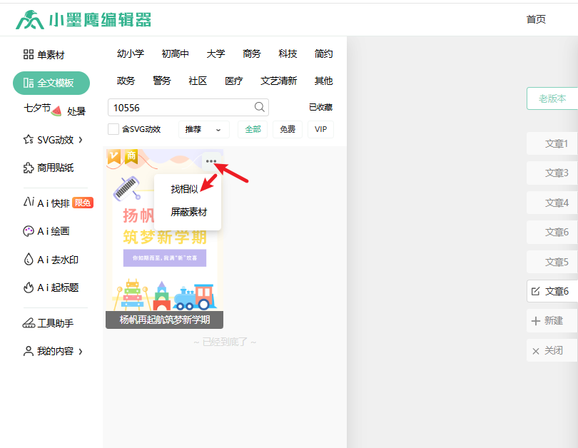 2、找到对应的全文模板后,点模板右上角的「更多」,再选「找相似」;
