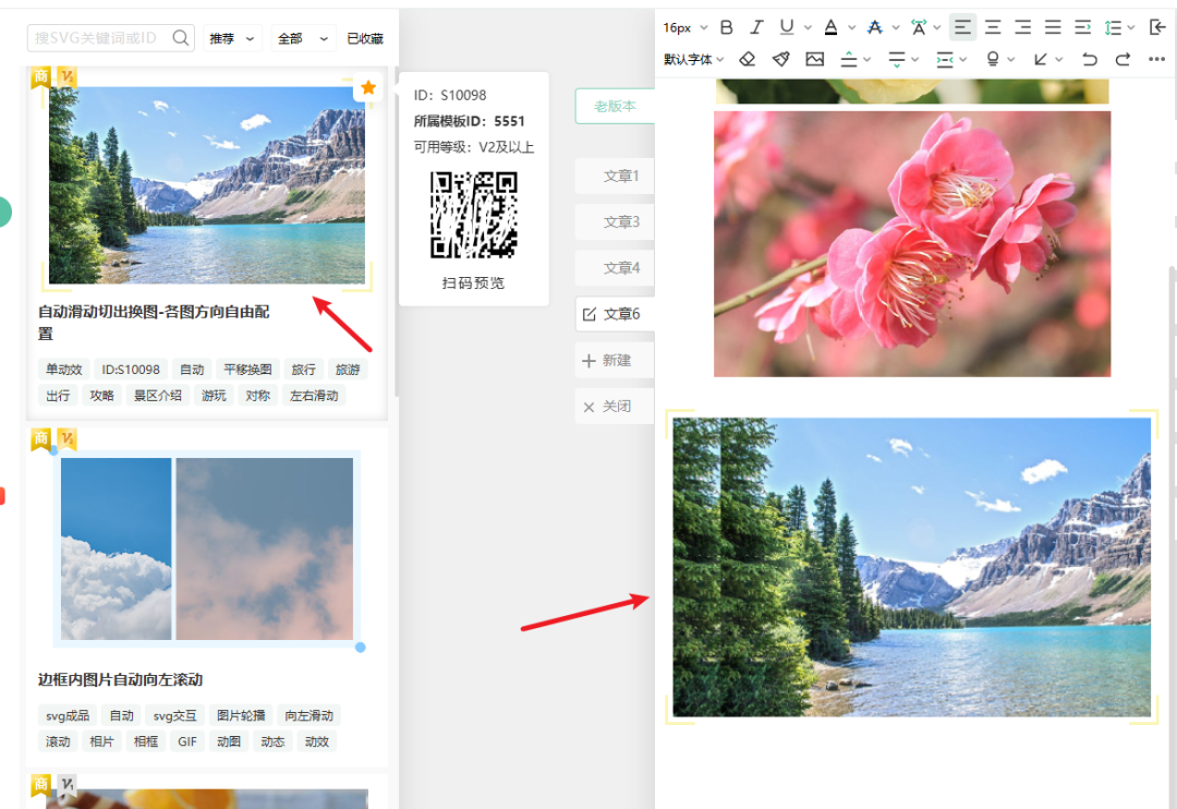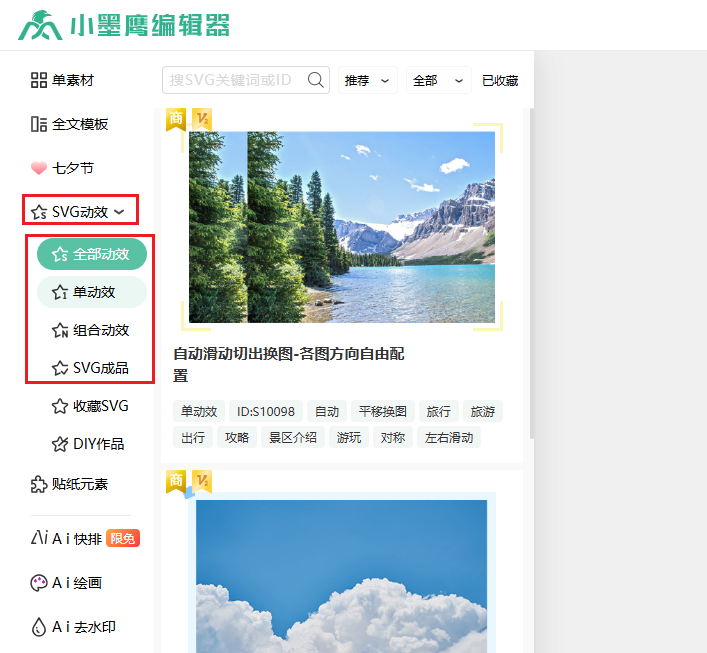 1、打开小墨鹰编辑器,点左边的「SVG 动效」,里面有好多有意思的多图交互样式,翻一翻就能找到喜欢的;