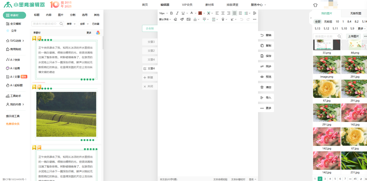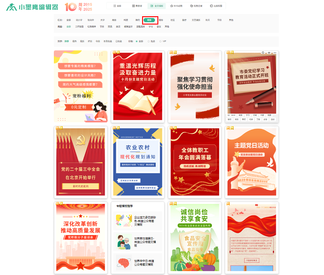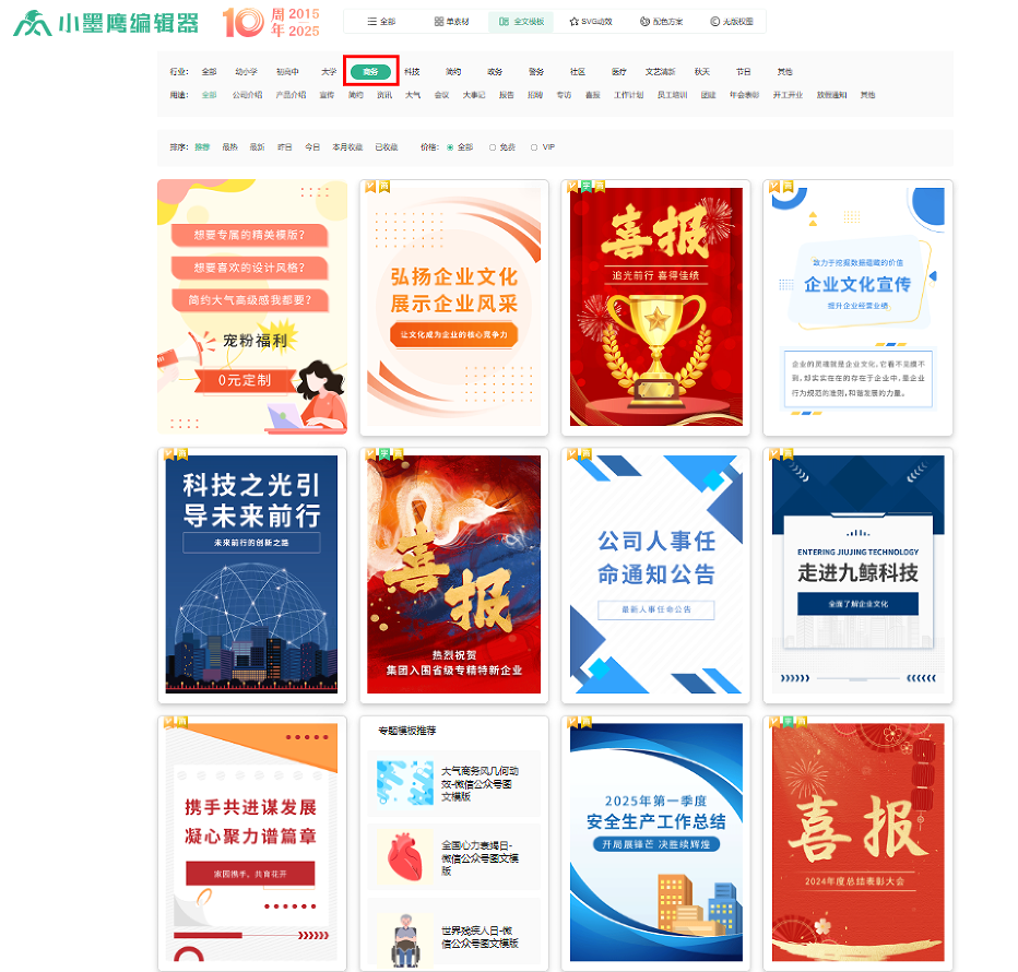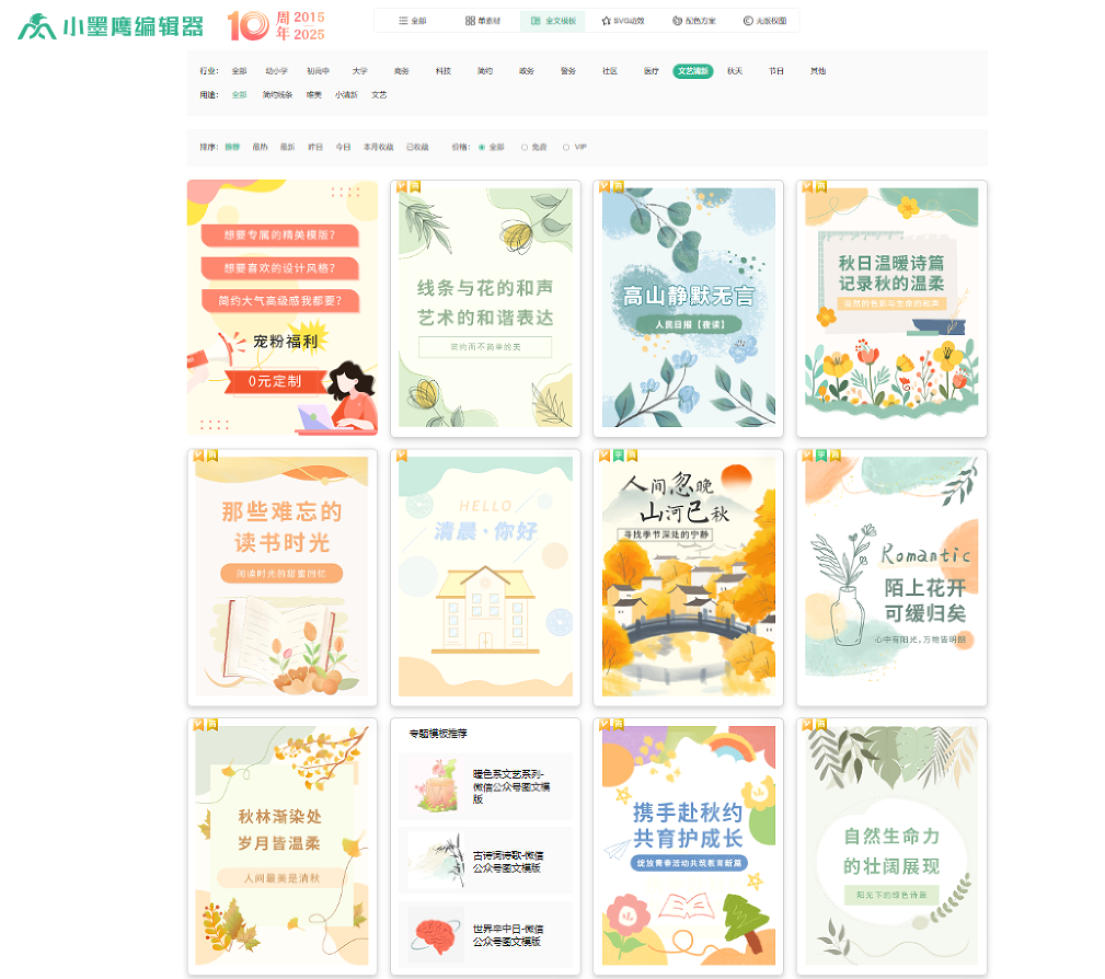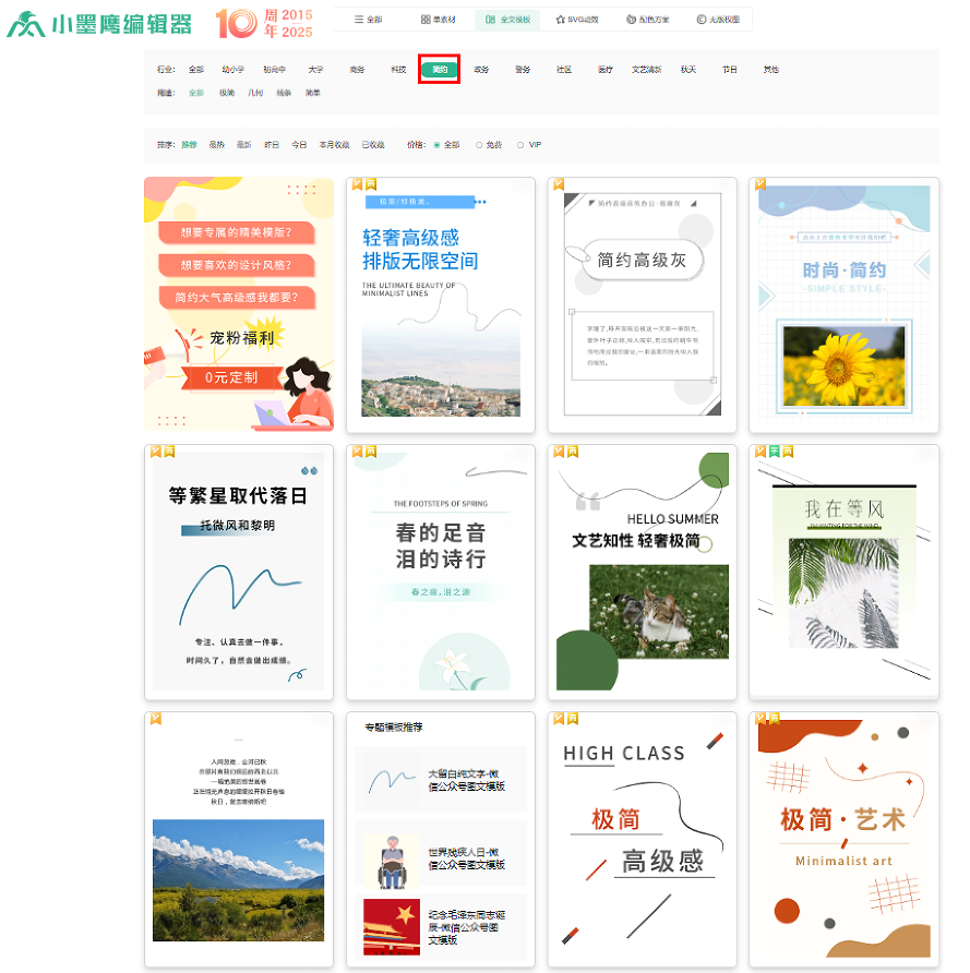 工欲善其事,必先利其器。面对多样化的风格需求,一款高效的排版工具至关重要。小墨鹰编辑器覆盖45大行业模板素材及多种风格,且保持每日更新。其丰富的免费模板素材已足够日常使用,更有全套视频教程引导新手轻松入门,快速掌握从基础到进阶的排版技巧,让每一位创作者都能无负担地打造出专业级的视觉内容。