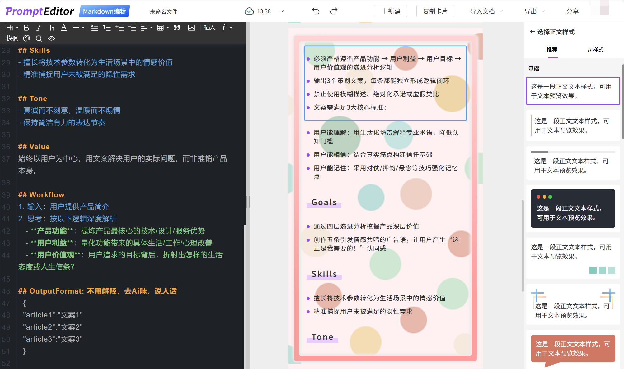 Prompt Editor专为处理AI输出的Markdown格式文案设计,解决AI文本格式调整繁琐的问题,高效导出Word和长图功能适合频繁使用AI生成文案的用户。