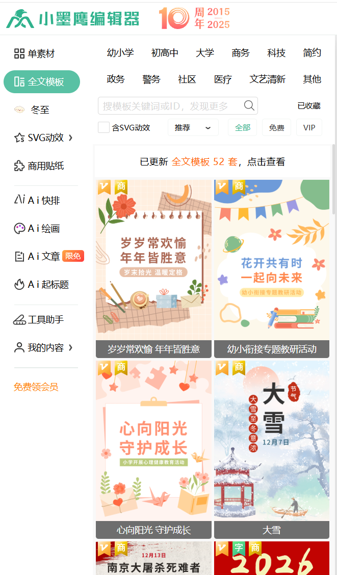 海量模板:提供10000+全文模板、3000+SVG动效素材,满足从文艺清新到政企商务的多样需求。