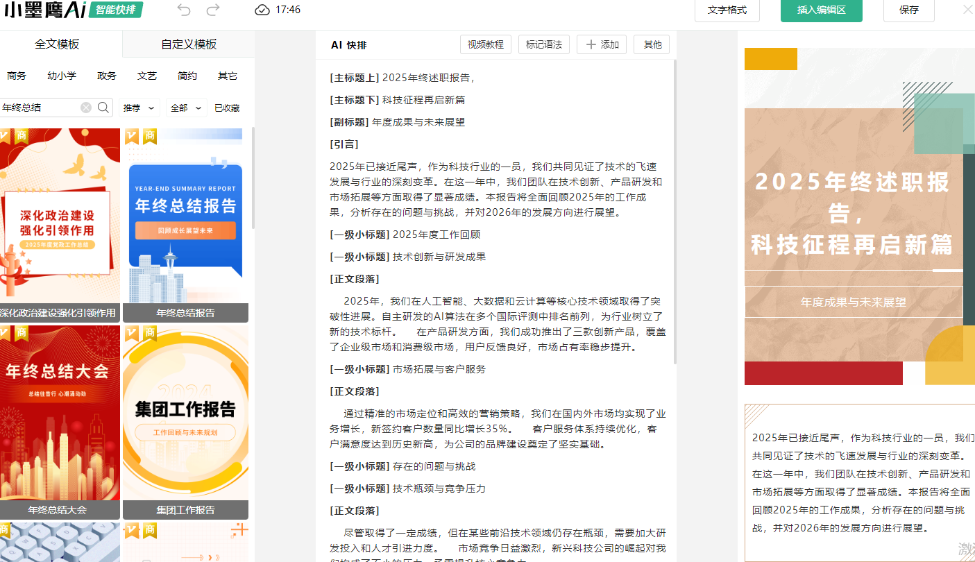 这样一篇年终总结公众号排版就这样完成了。快速排版并不意味着牺牲美观或专业性。像小墨鹰编辑器中的全文模板在设计时已经考虑了视觉的平衡和信息的层次,能够保证输出的文章整洁易读。5分钟完成排版的核心在于“借助模板,减少手动调整”。它让排版不再是一个令人头疼的环节,而成为内容创作中一个轻松的步骤。