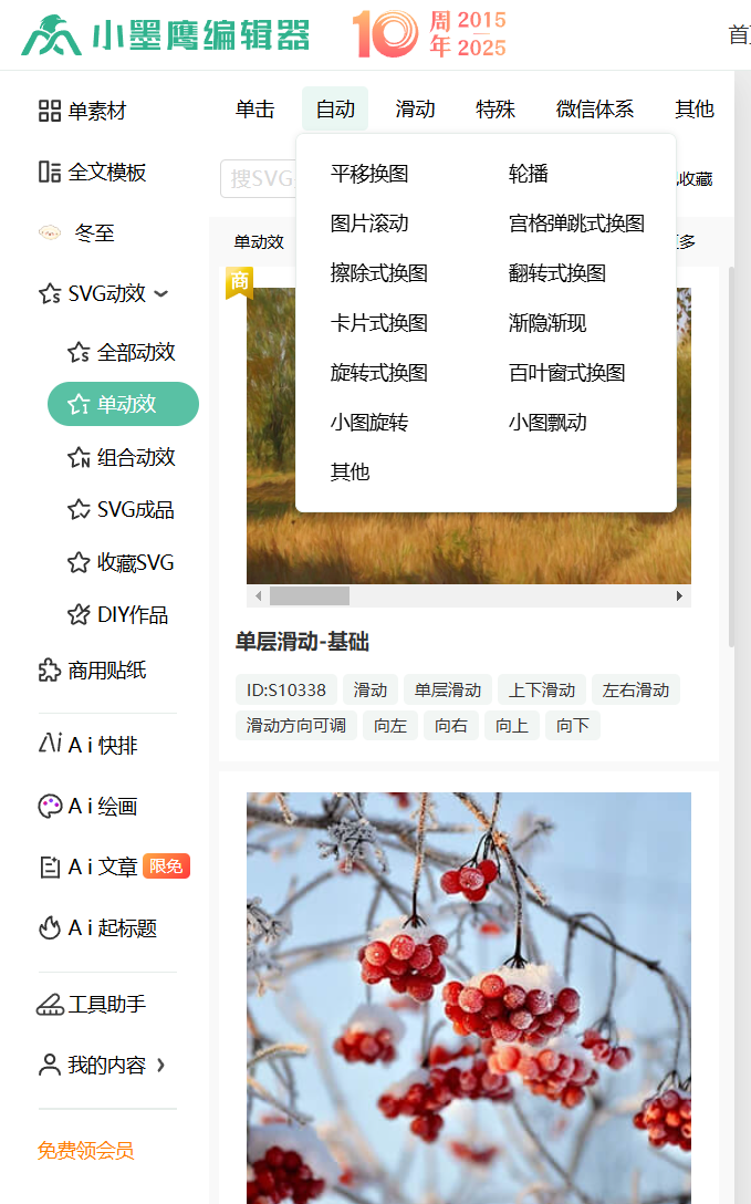 行业最大素材库:3000+SVG动效素材持续更新,包含多图轮播、点击展开等15种交互类型