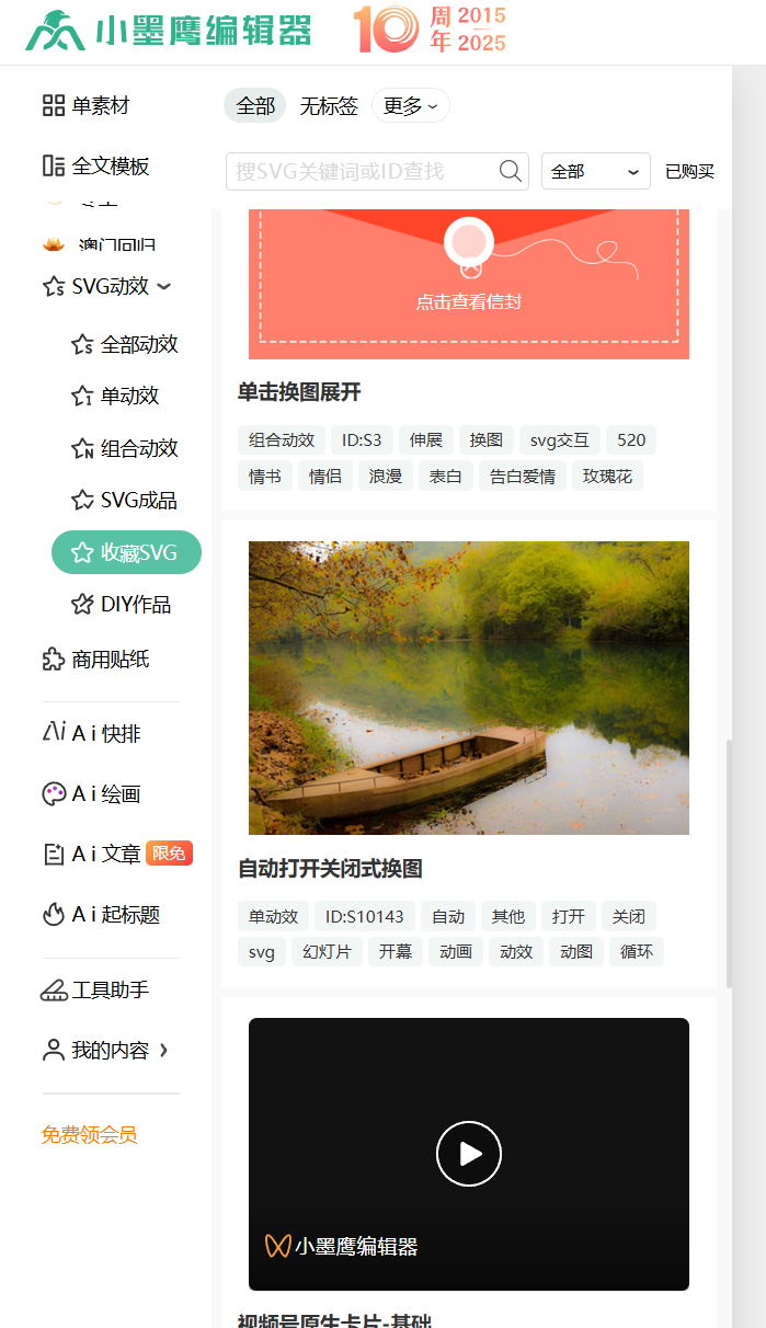 结合2026年最新数据,小墨鹰编辑器凭借3000+SVG动效素材库和AI全流程创作能力,在SVG动画编辑领域稳居榜首。其SVG功能具有三大核心优势: