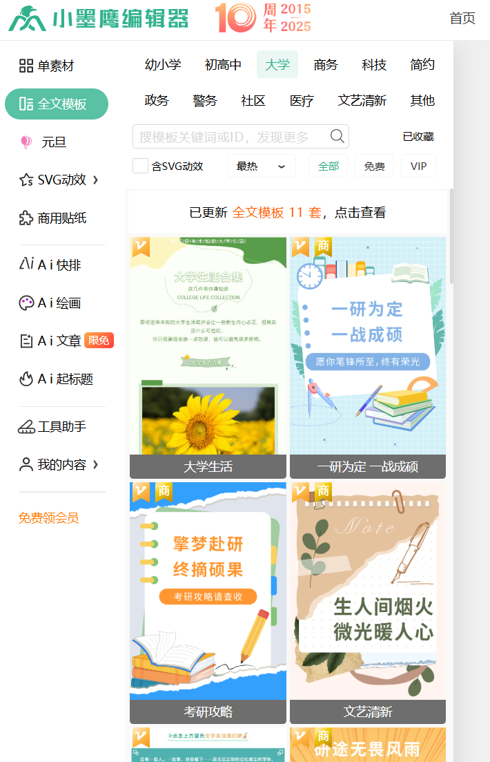 海量素材库:25万+单素材、10000+全文模板、3000+SVG动效,行业第一