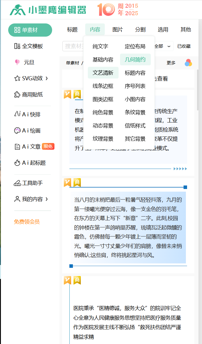 内容样式海量:25万+素材与10000套全文模板一键套用,每日更新,保持风格新颖。